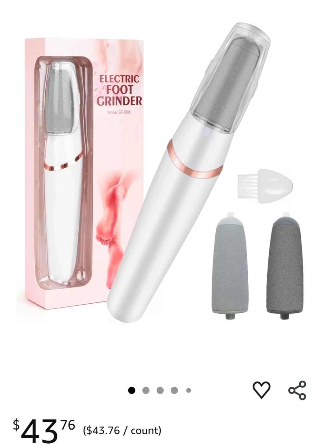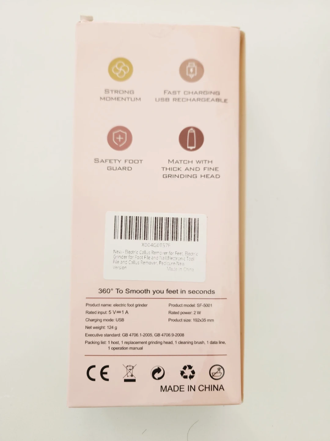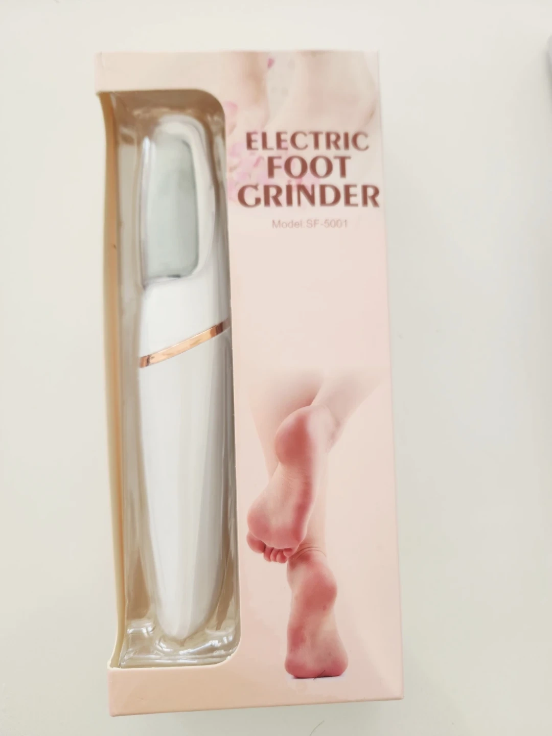 Electric foot grinder, model SF-5001. Comes with two roller heads: a fine one for daily maintenance and a coarse one for removing calluses. USB rechargeable with a safety foot guard. Net weight is 124g.