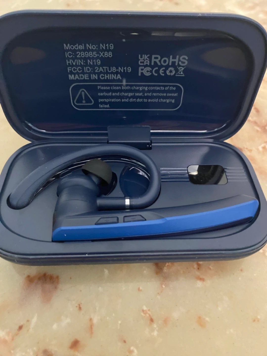 This is a single N19 Bluetooth headset in a dark blue case with blue accents. It has a hook that goes over the ear for a secure fit. This headset is suitable for hands-free calls and listening to audio on the go.