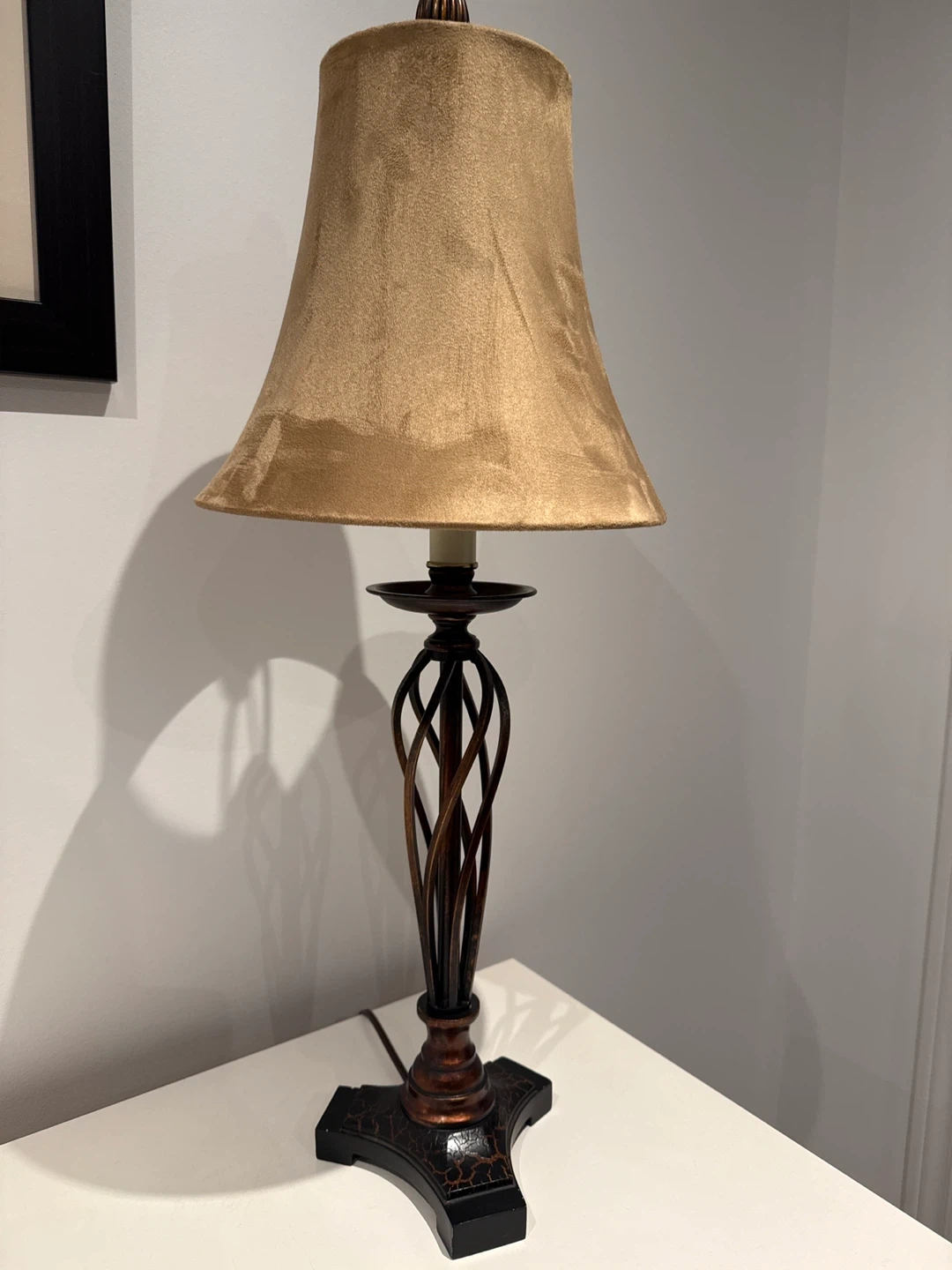 This table lamp features a unique twisted metal base with a decorative patterned black base. It comes with a classic bell-shaped fabric shade in a warm, neutral tone. It's perfect for adding a touch of ambient lighting to any room.