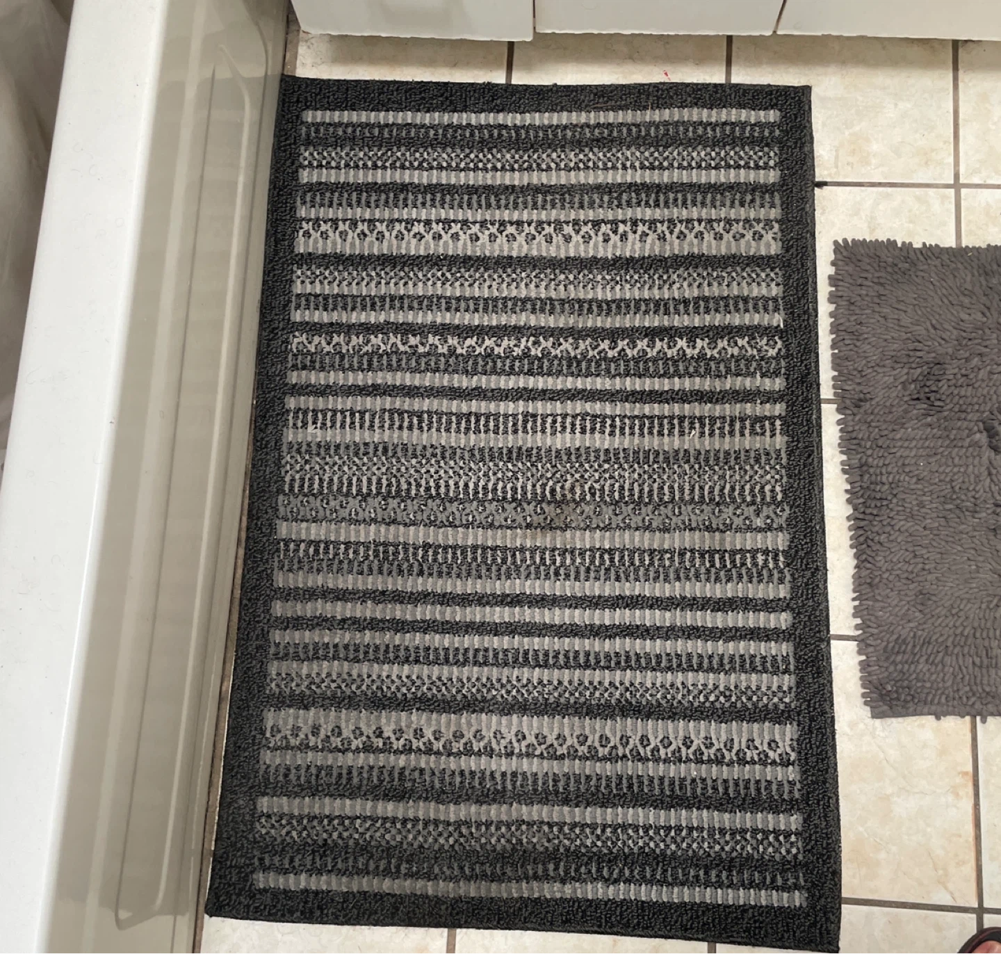 Two grey bath mats. One features a shaggy chenille design, while the other has a striped pattern.