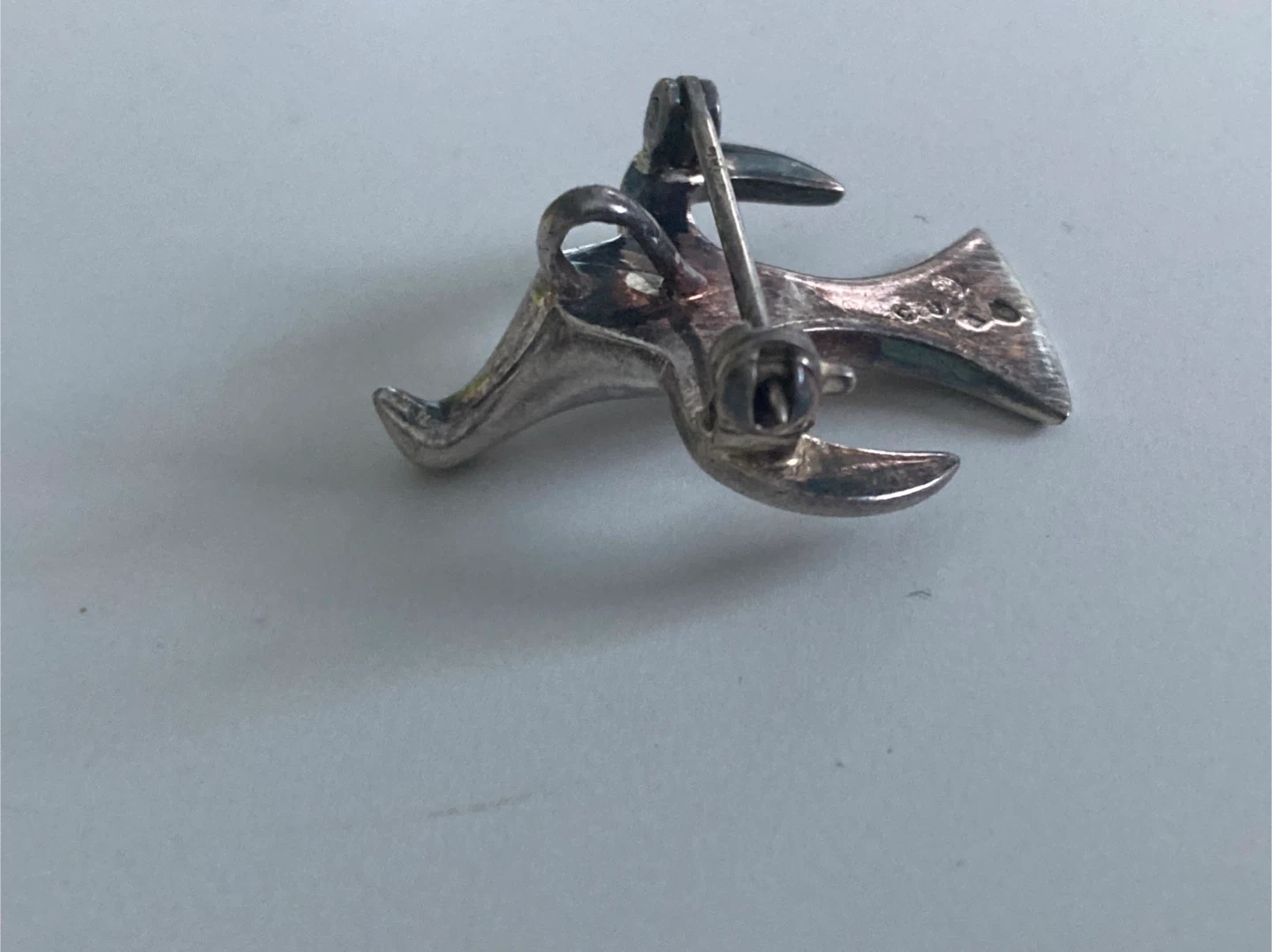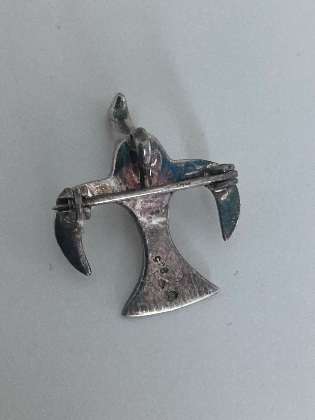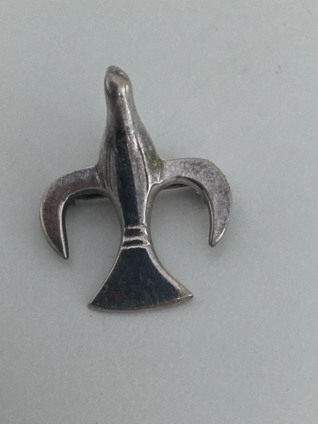 This is a silver-tone brooch in the shape of a bird. It has a secure pin backing. It's a nice accessory for clothing!