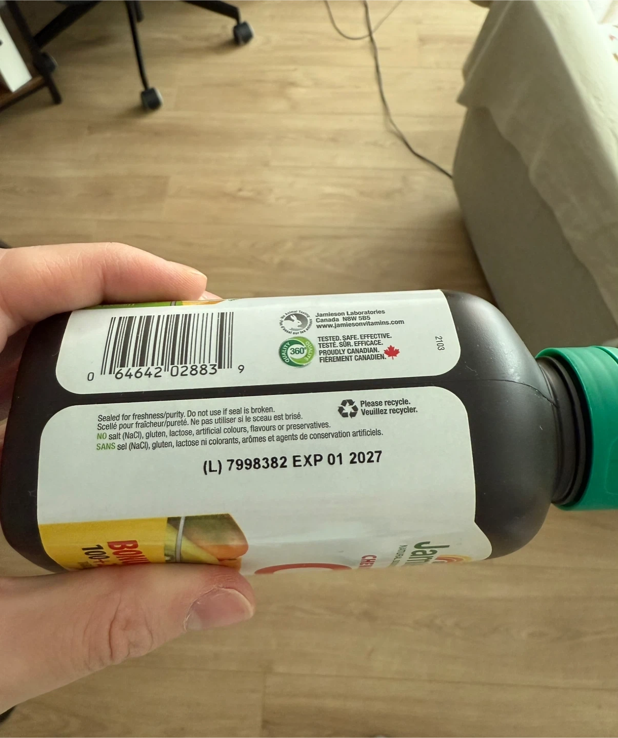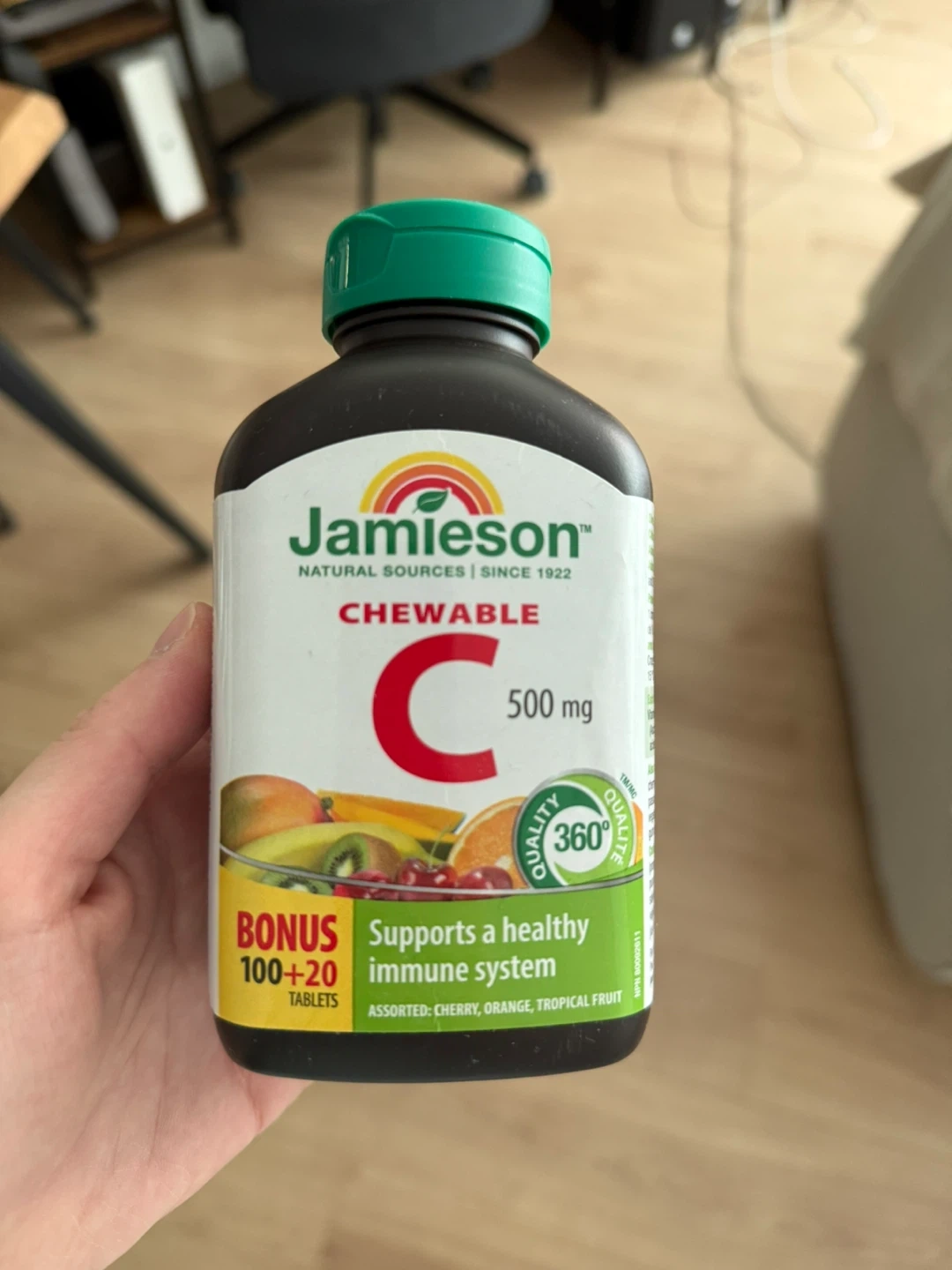 Jamieson Chewable Vitamin C tablets, 500 mg strength. Supports a healthy immune system. Assorted cherry, orange, and tropical fruit flavours. Expiry is 01 2027.
