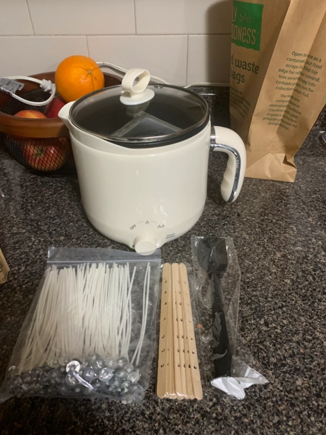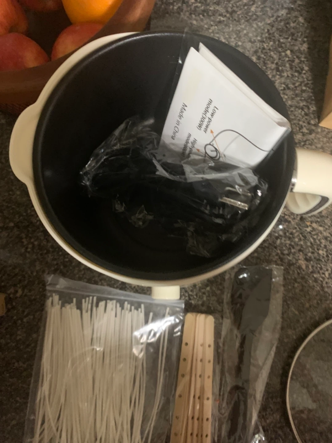 This portable electric pot is great for candle wax meltingIt comes with a glass lid, a spatula, and what appears to be skewers or sticks for cooking. The pot has two heat settings, 'Off' and 'On'.