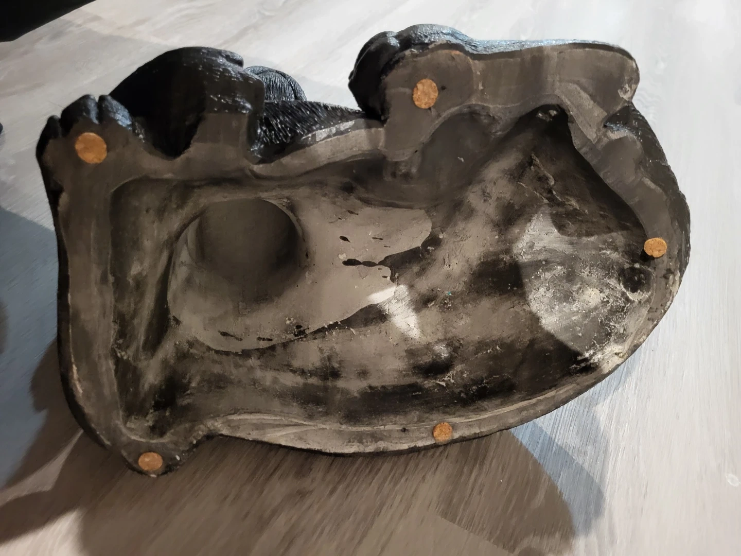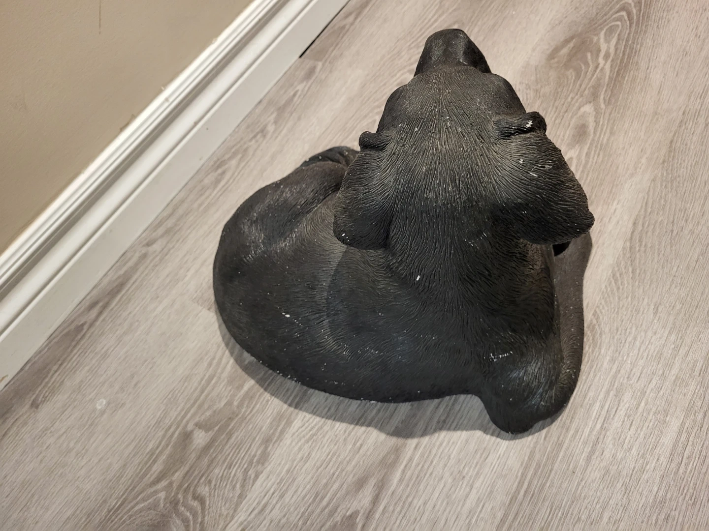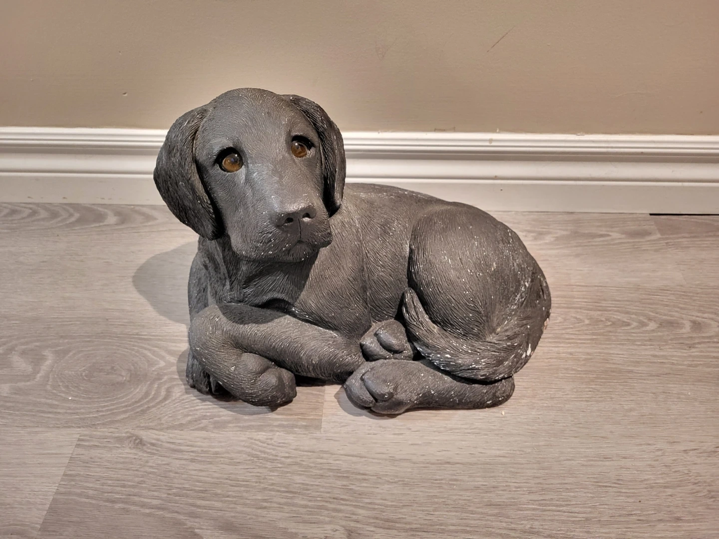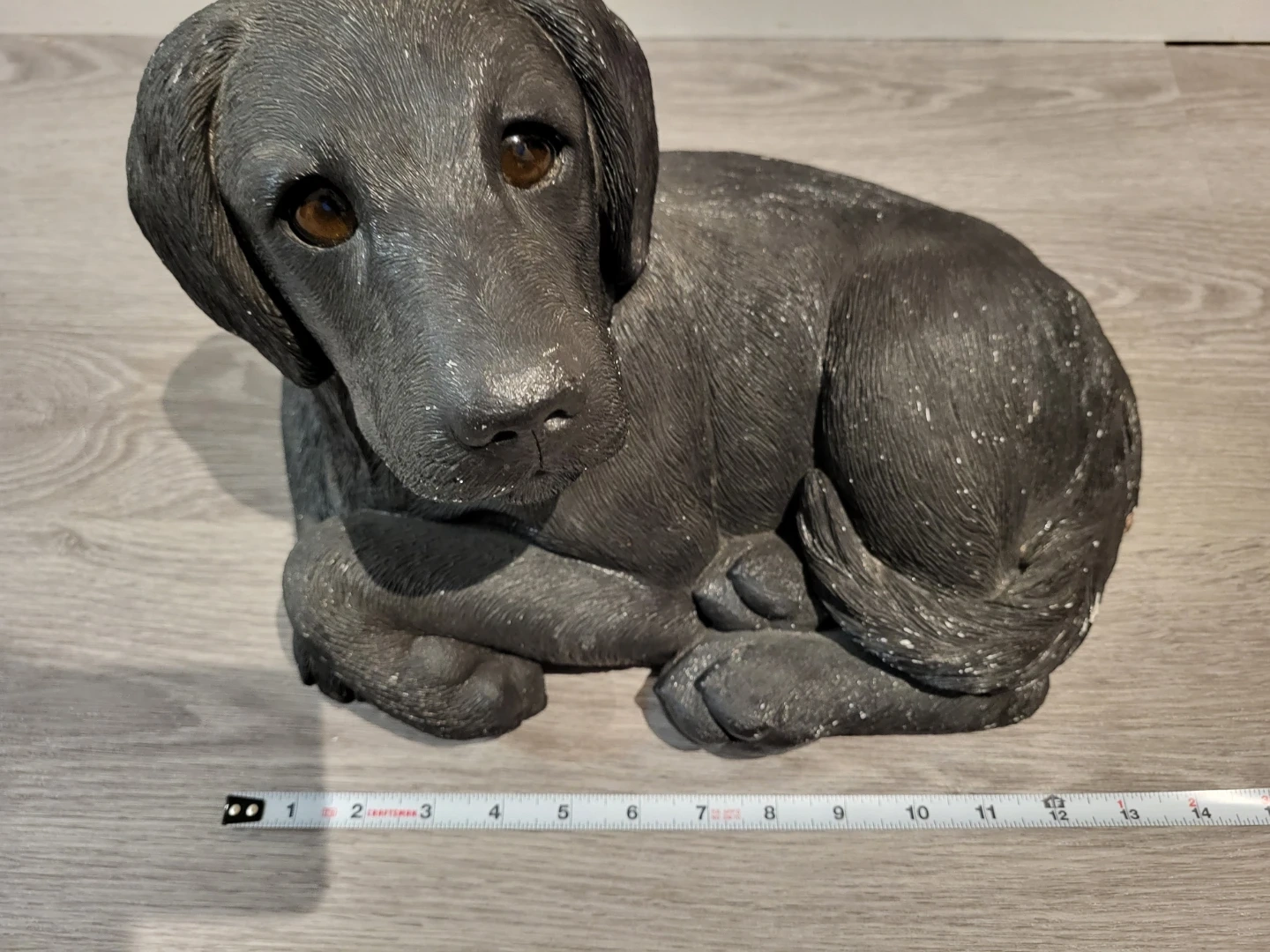 A cute black Lab figurine, perfect for display. Looks to be make of concrete and has realistic glass eyes.