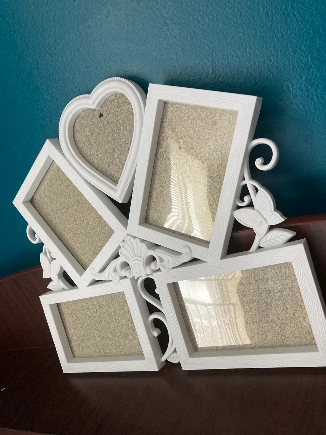 This multi photo frame is white and features a decorative heart detail at the top. It holds multiple pictures and has ornate scrollwork along the sides. It's great for displaying cherished memories!
