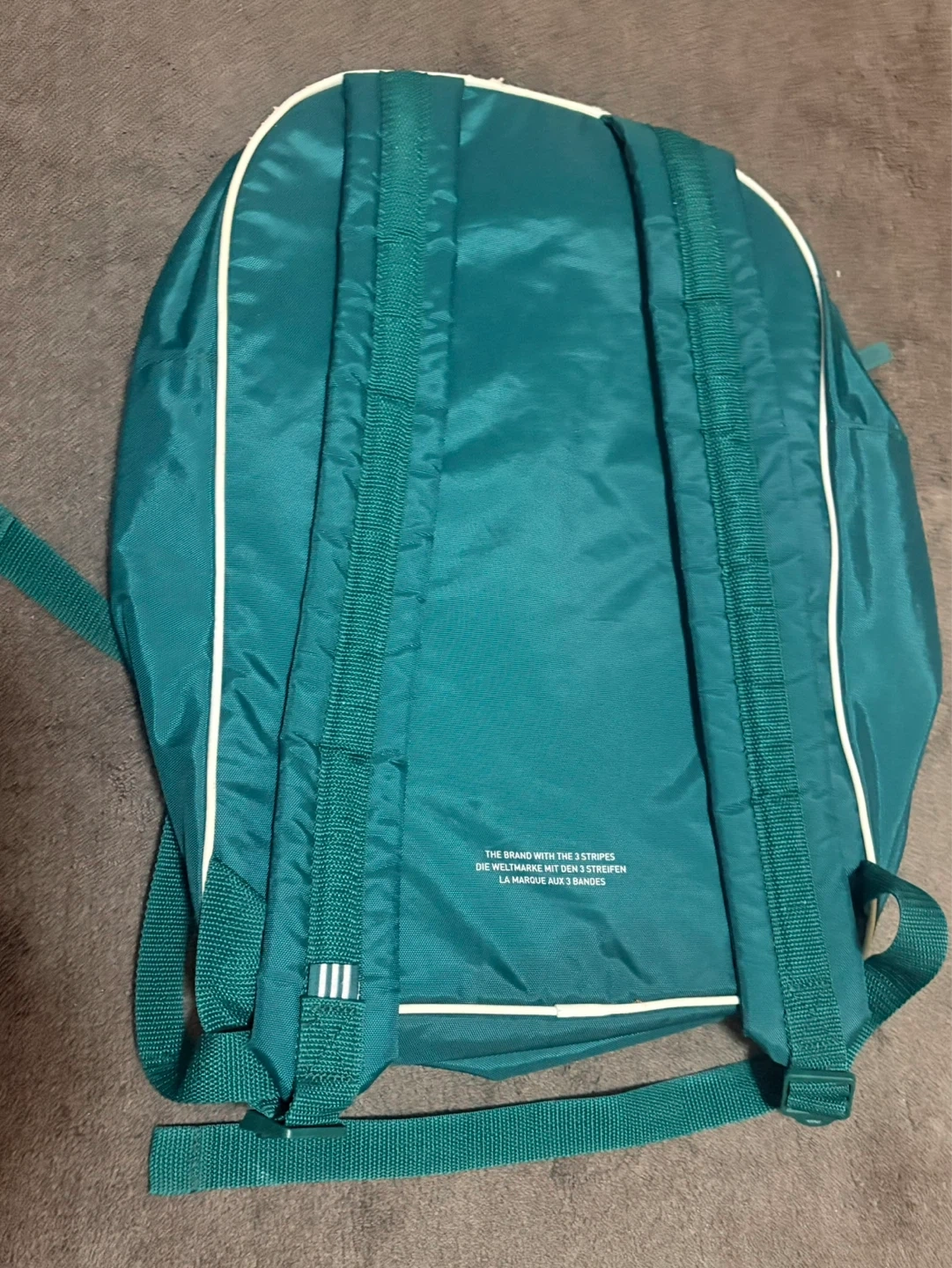 This is a vintage Adidas backpack with the white trim. It has a main compartment and a front zippered pocket. The straps are adjustable.