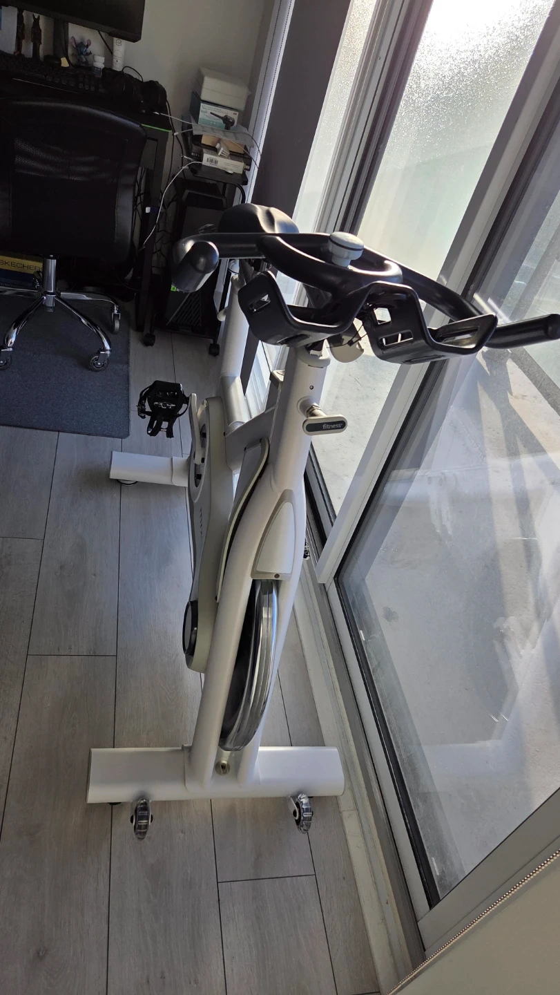 This is a MYX Fitness bike. It's a stationary exercise bike designed for home workouts. It has adjustable handlebars and seat for a customized fit. The bike provides a smooth and quiet riding experience, perfect for cardio sessions. It's suitable for users of various fitness levels looking to get a great workout at home.