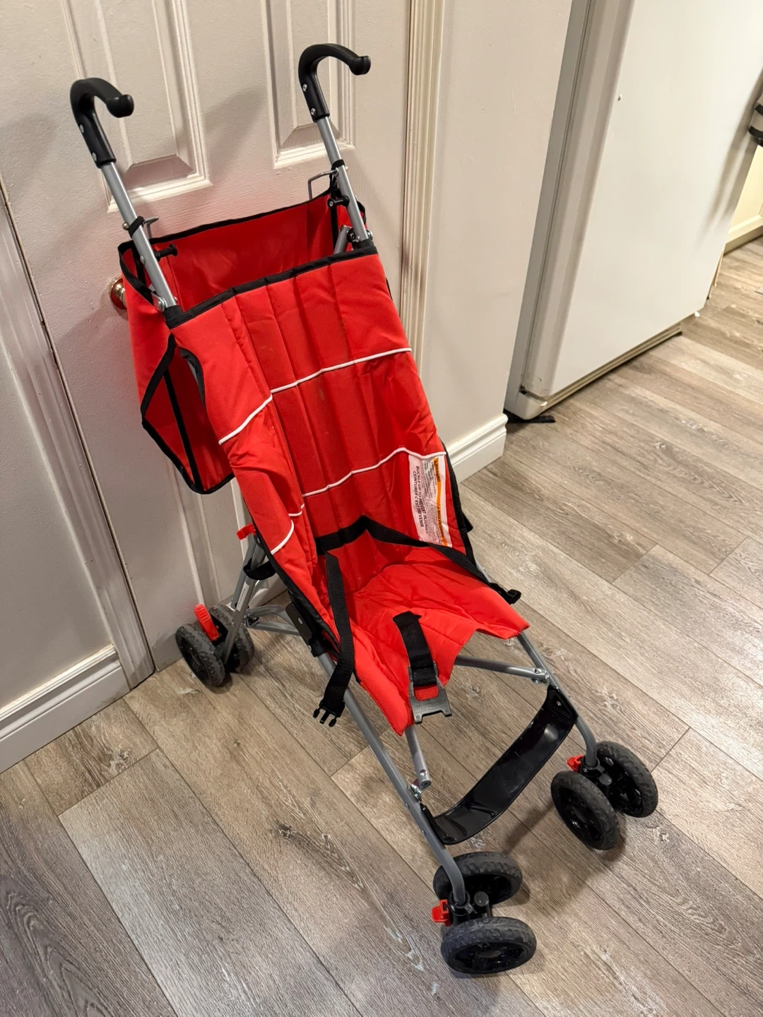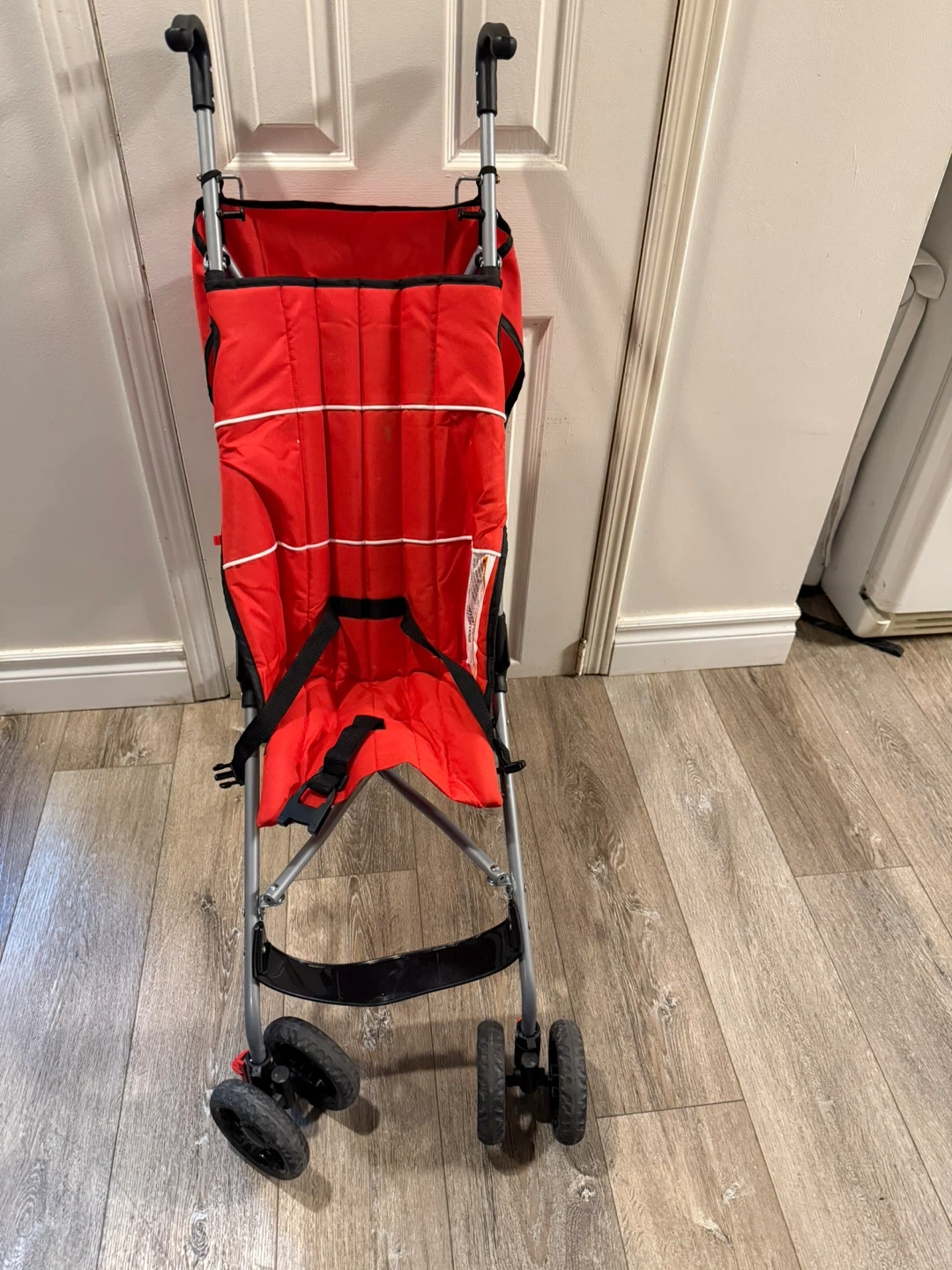 This red stroller is designed for children up to 40 lbs (18 kg) and 37 inches tall. It's suitable for ages 6-36 months. Its lightweight design makes it easy to manoeuvre. A great option for families on the go!