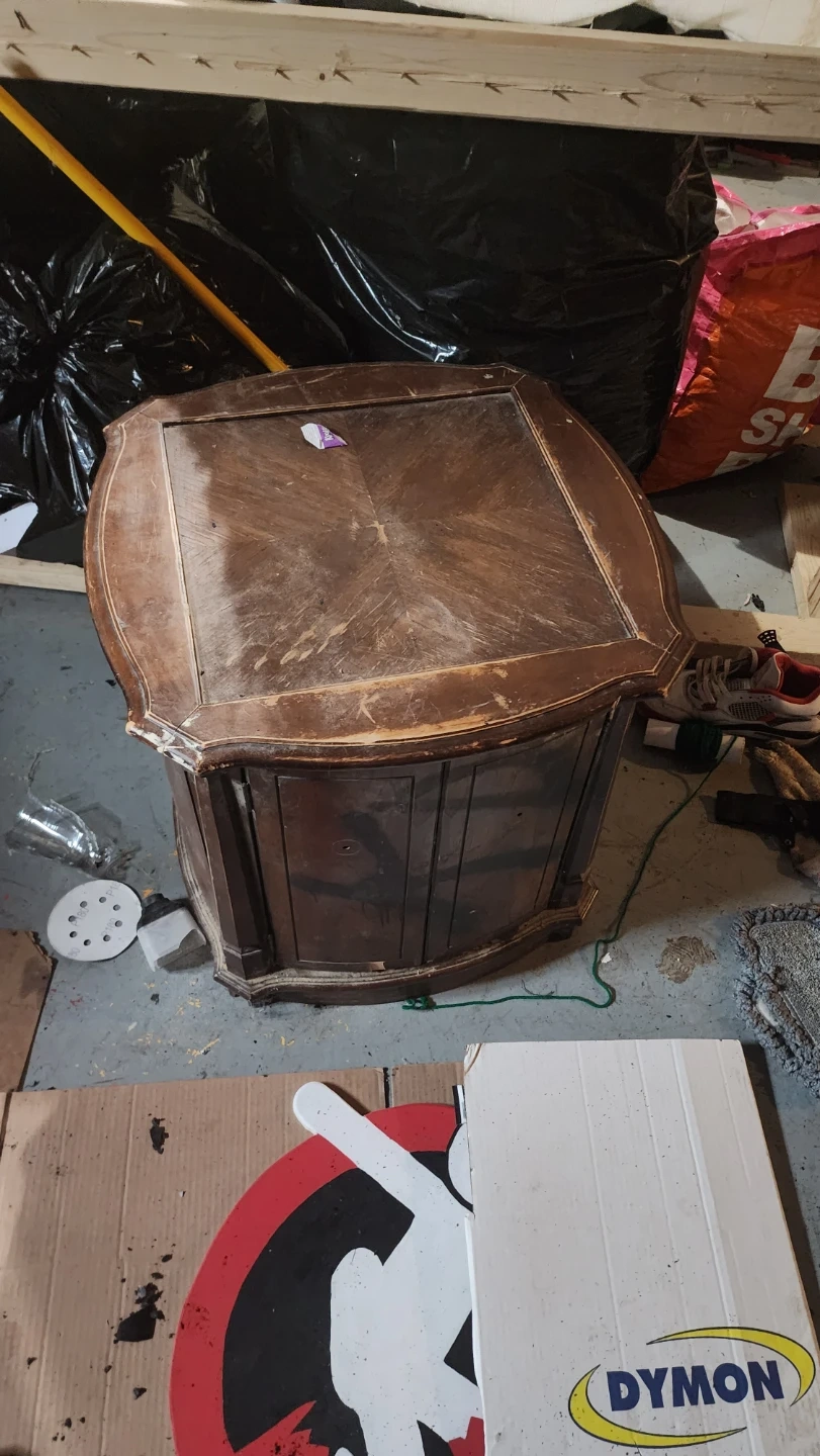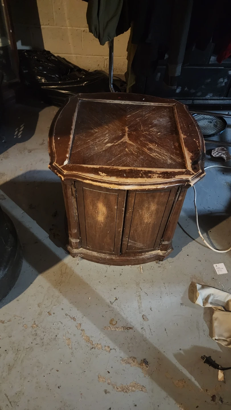 This vintage wooden side table features a cabinet with double doors. The top has an inlaid wood pattern. Shows some wear and tear, perfect for refinishing or a rustic look. Measurements: approx 22" tall, 18" wide, 16" deep.