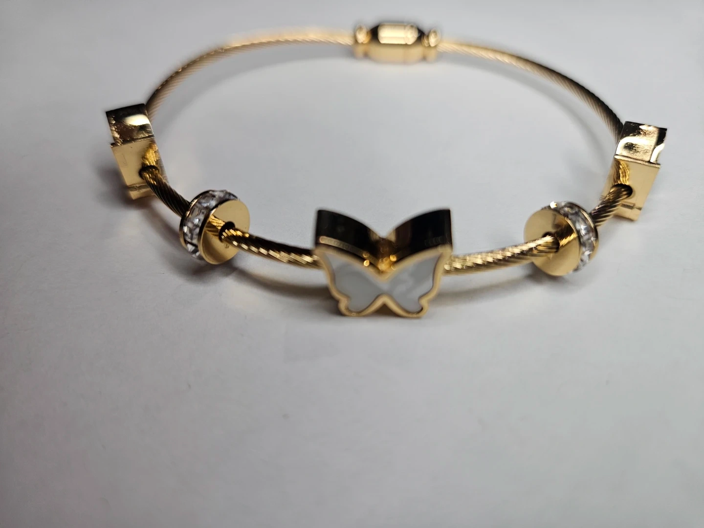 This gold-tone bracelet features a beautiful butterfly charm with a pearlescent inlay. It's accented with clear crystal beads and has a flexible cable design. It's a lovely accessory for everyday wear or special occasions!