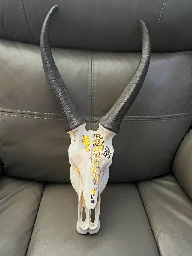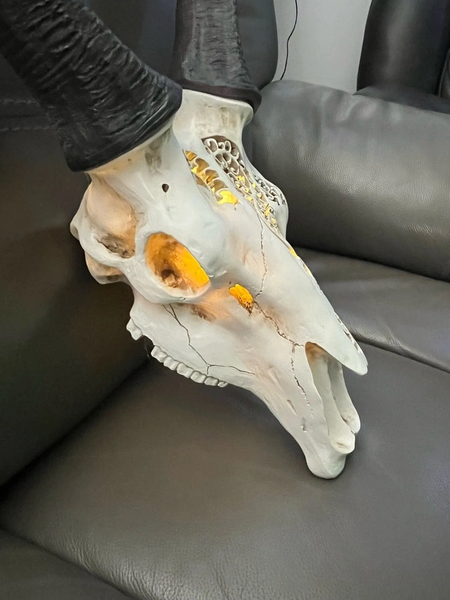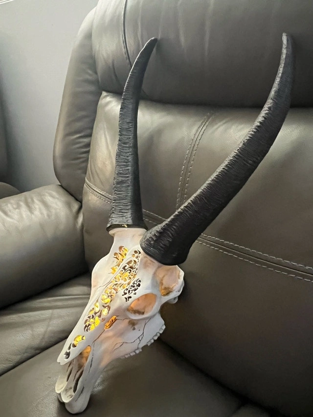 Enhance your home decor with this intricately detailed, faux-antelope skull. This piece combines the striking look of a South African Springbok with modern artistic carving and warm LED backlighting. Perfect for a gallery wall, office, or as a unique focal point in a living room. Features high-quality floral and geometric carvings. Integrated battery-powered LED unit creates a beautiful warm glow through the carvings. Made of durable resin for a realistic look. Includes a heavy-duty keyhole bracket for easy mounting. Realistic black, ridged lyre-shaped horns. Comes with a remote to turn on and off. Condition: Used - Good. Cash accepted.