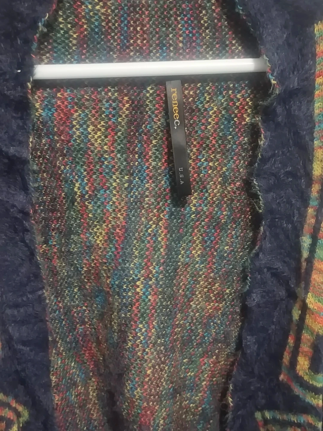This Reneec. cardigan features a vibrant, multi-coloured geometric pattern with fuzzy navy trim. It's an open-front style, perfect for layering over a simple top. A cozy addition to any fall or winter outfit!