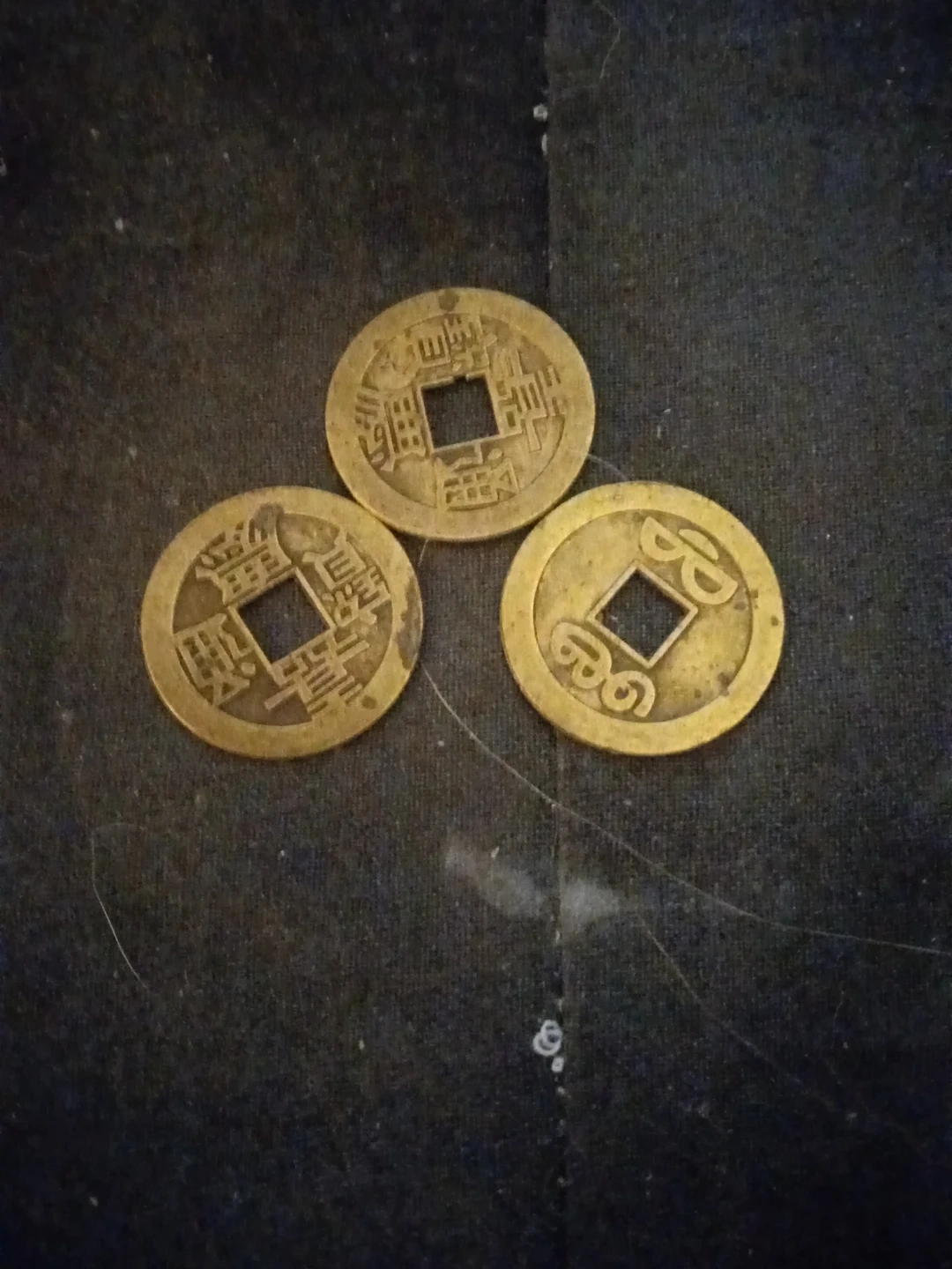 Three vintage-style Chinese coins, each featuring intricate characters and a central square hole. They appear to be made of brass or a similar metal. These coins are commonly used for Feng Shui or as decorative charms.