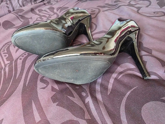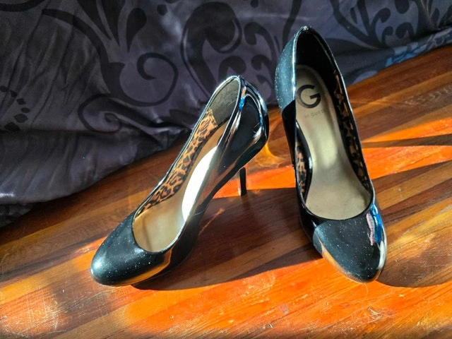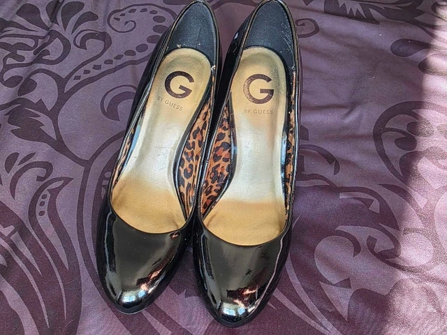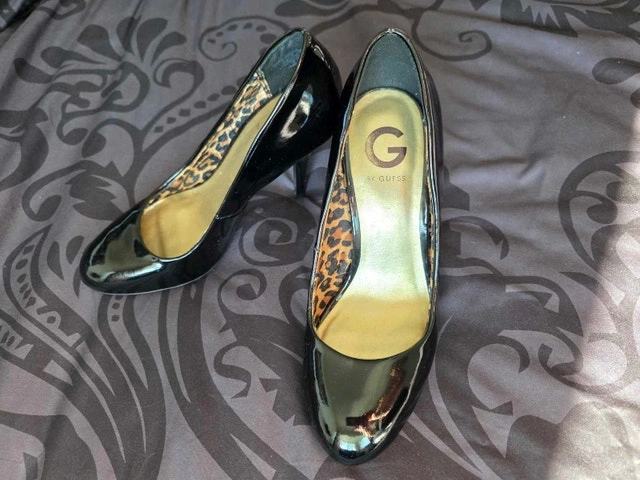 Make a statement with these bold and sophisticated stiletto pumps from G by Guess. They feature a high-shine black patent exterior with a hidden surprise—vibrant leopard print insoles and lining for a touch of "mob wife" luxury aesthetic. Brand: G by Guess. Style: Classic pointed-toe stiletto pump. Finish: Glossy black patent leather with leopard-patterned interior. Heel Height: Approx. 4–5 inch stiletto. Condition: Gently used; light surface wear on soles, but the patent uppers and interior lining are crisp and clean.
