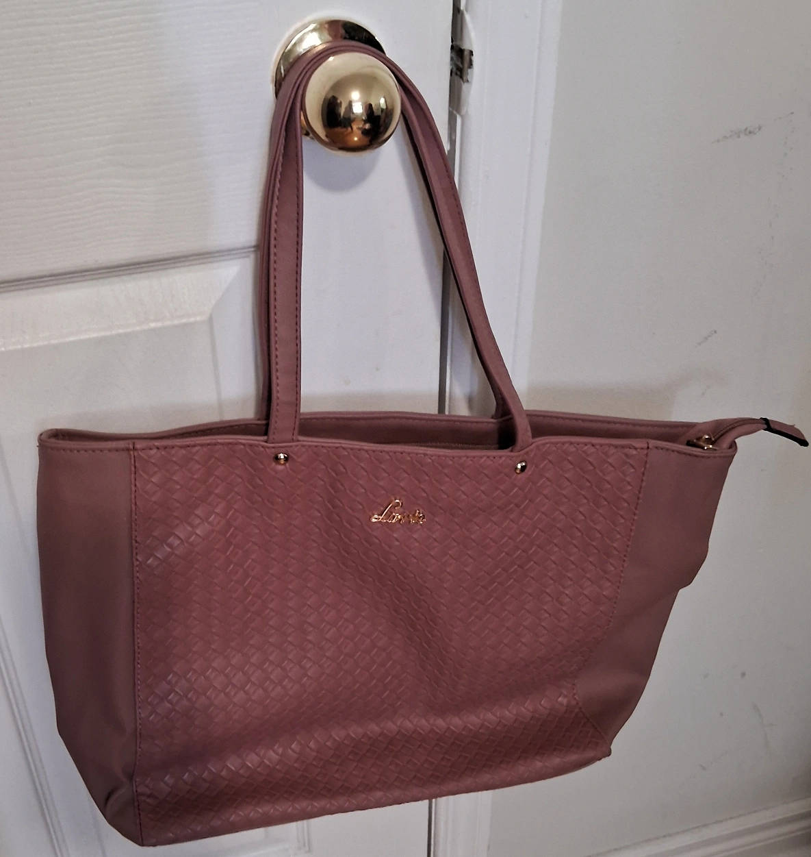 Large mauve tote bag. Features woven texture and gold-toned hardware. Zipper closure and small zippered pocket. Two top handles.
