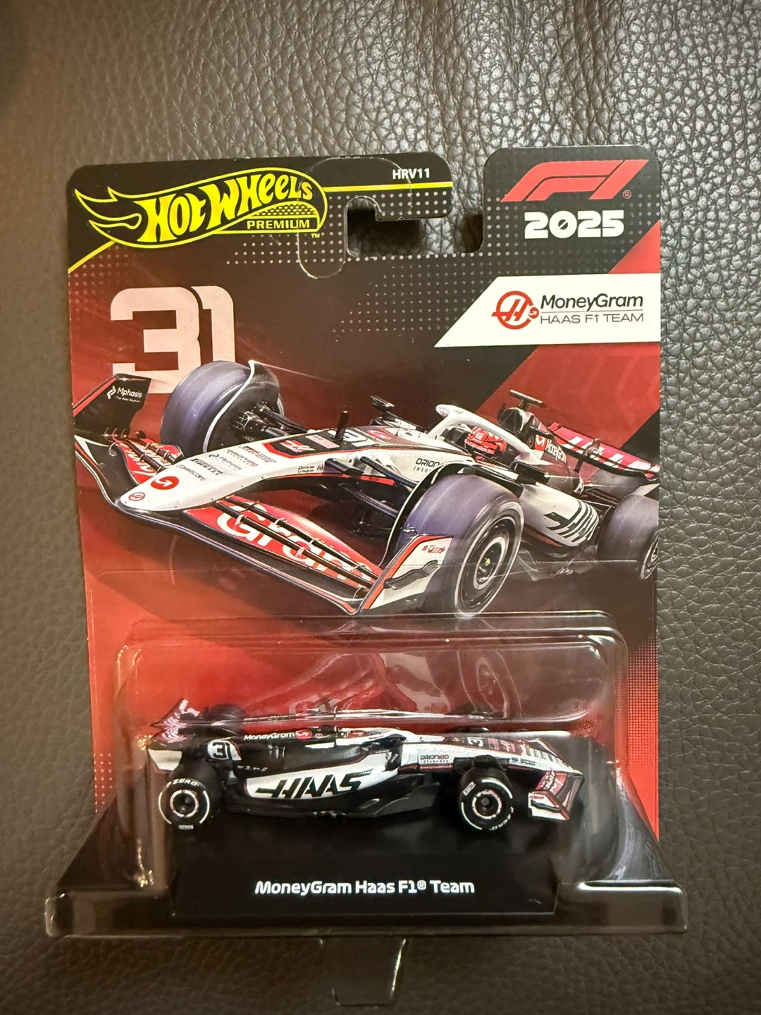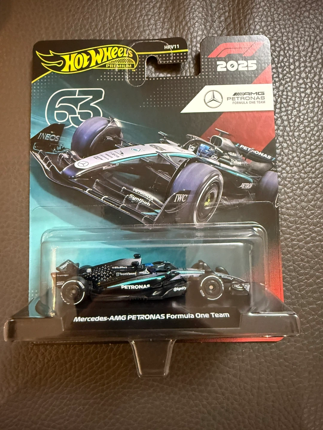 Four Hot Wheels Premium diecast cars featuring Formula 1 teams. Includes Mercedes-AMG Petronas, MoneyGram Haas, McLaren, and Visa Cash App RB. Brand new in original packaging!
