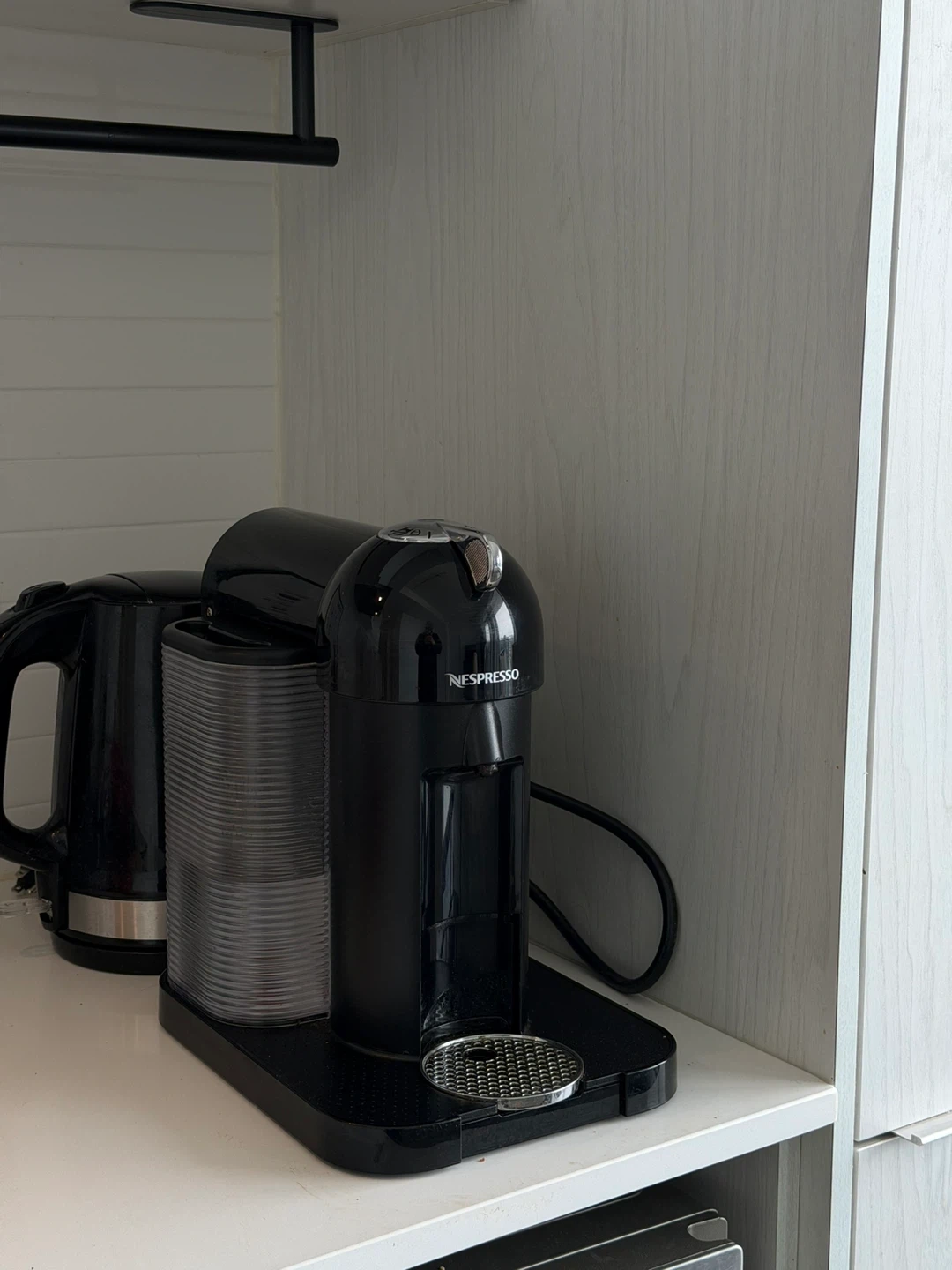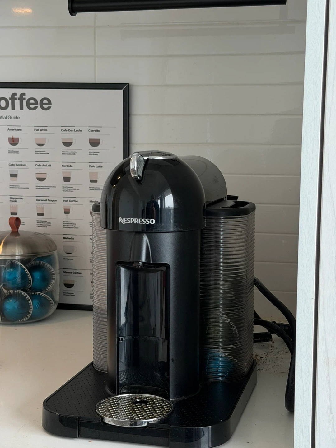 This is a black Nespresso coffee machine. It's designed for making a variety of coffee drinks. This machine is perfect for quick morning brews!