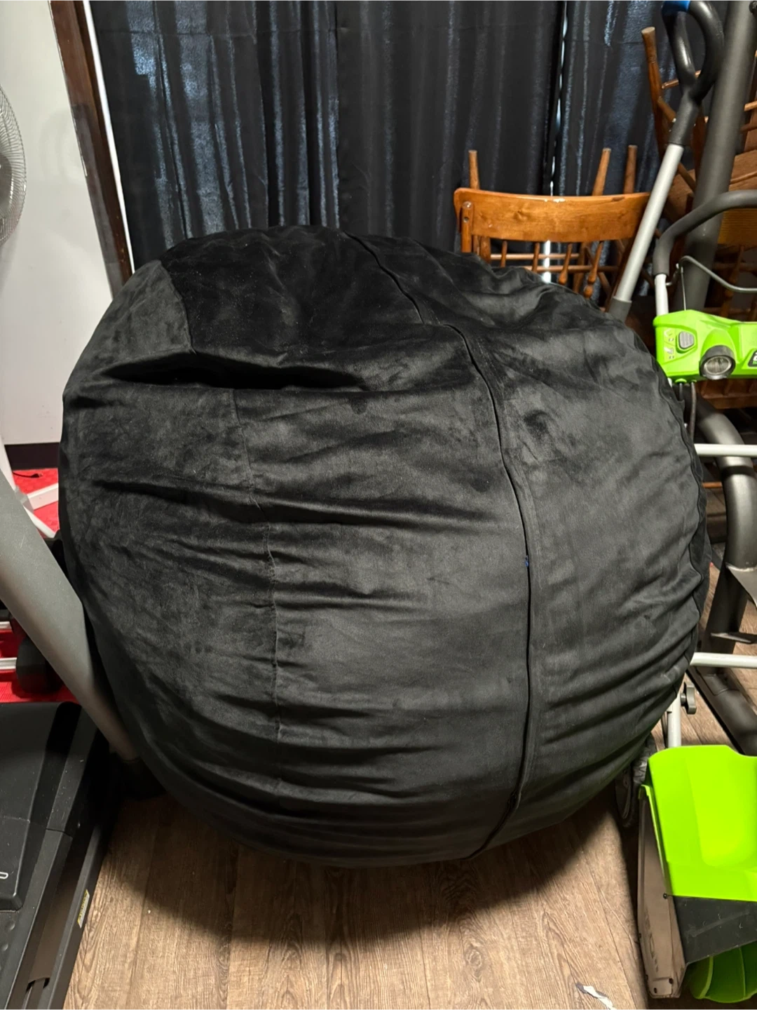 This is a large, round bean bag chair in a soft black velvet material. It's perfect for lounging or gaming. The cover is durable and comfortable.