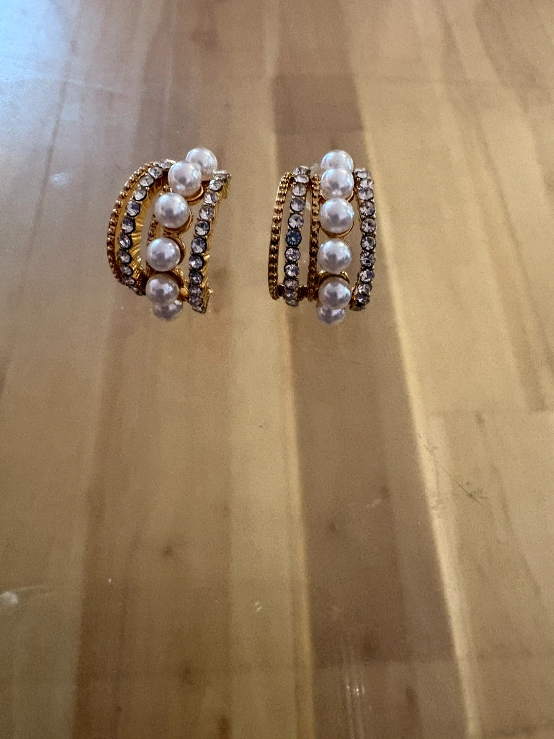 Elegant gold-tone hoop earrings adorned with faux pearls and sparkling rhinestones. These statement earrings add a touch of glamour to any outfit. They offer a secure clasp for comfortable wear.