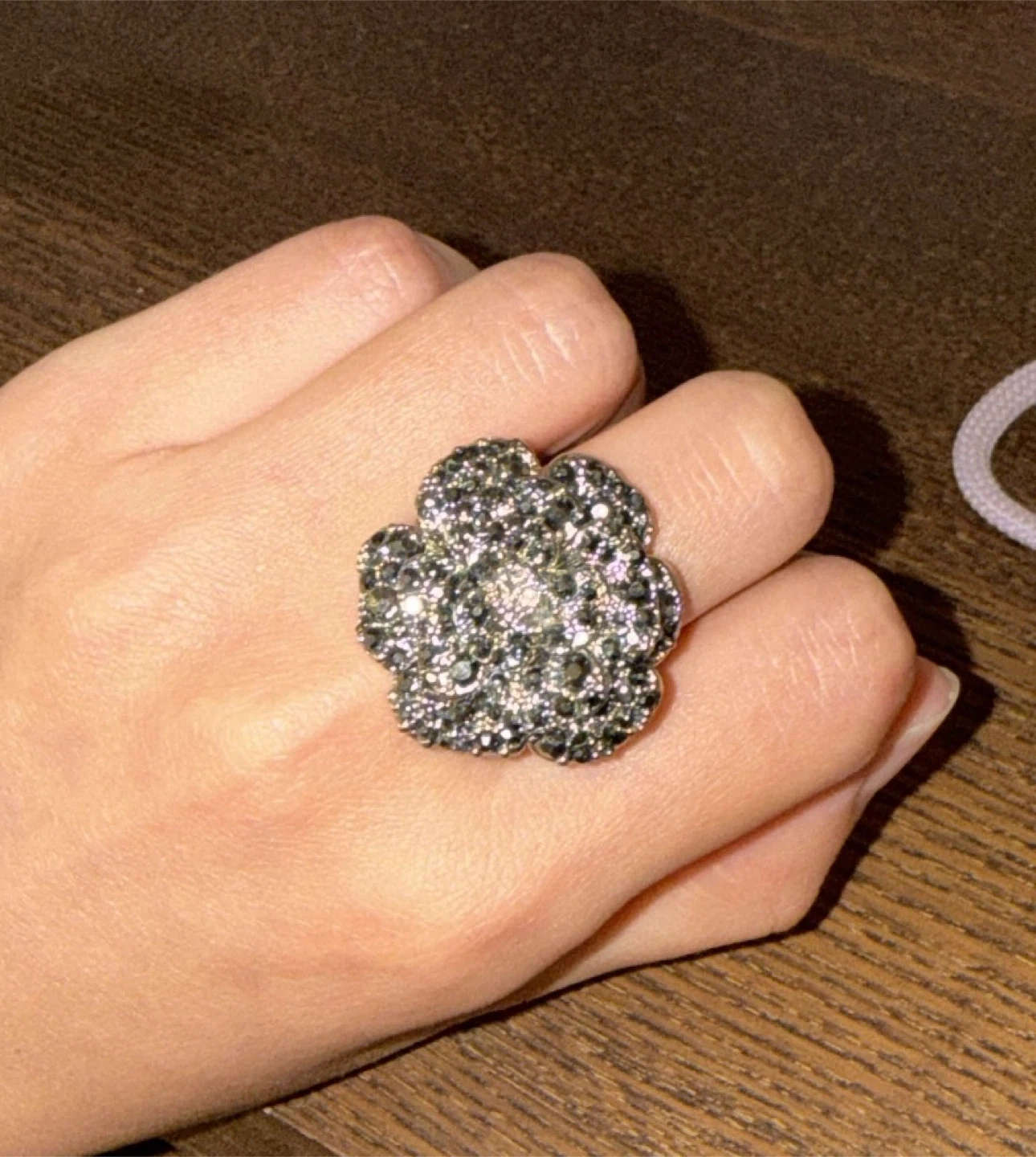 A beautiful Chanel ring designed with a floral cluster. It features marcasite and crystal accents for a sparkling look. This statement ring adds a touch of elegance to any outfit.