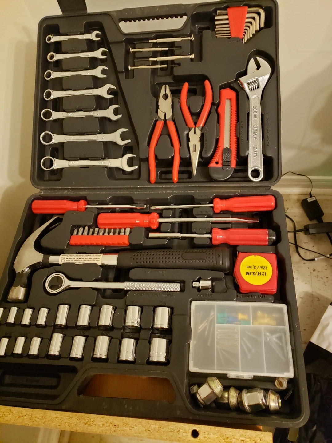Includes a hammer, wrenches, screwdrivers, pliers, and a utility knife. Also comes with a socket set and a small container of screws and anchors. A tape measure is included.