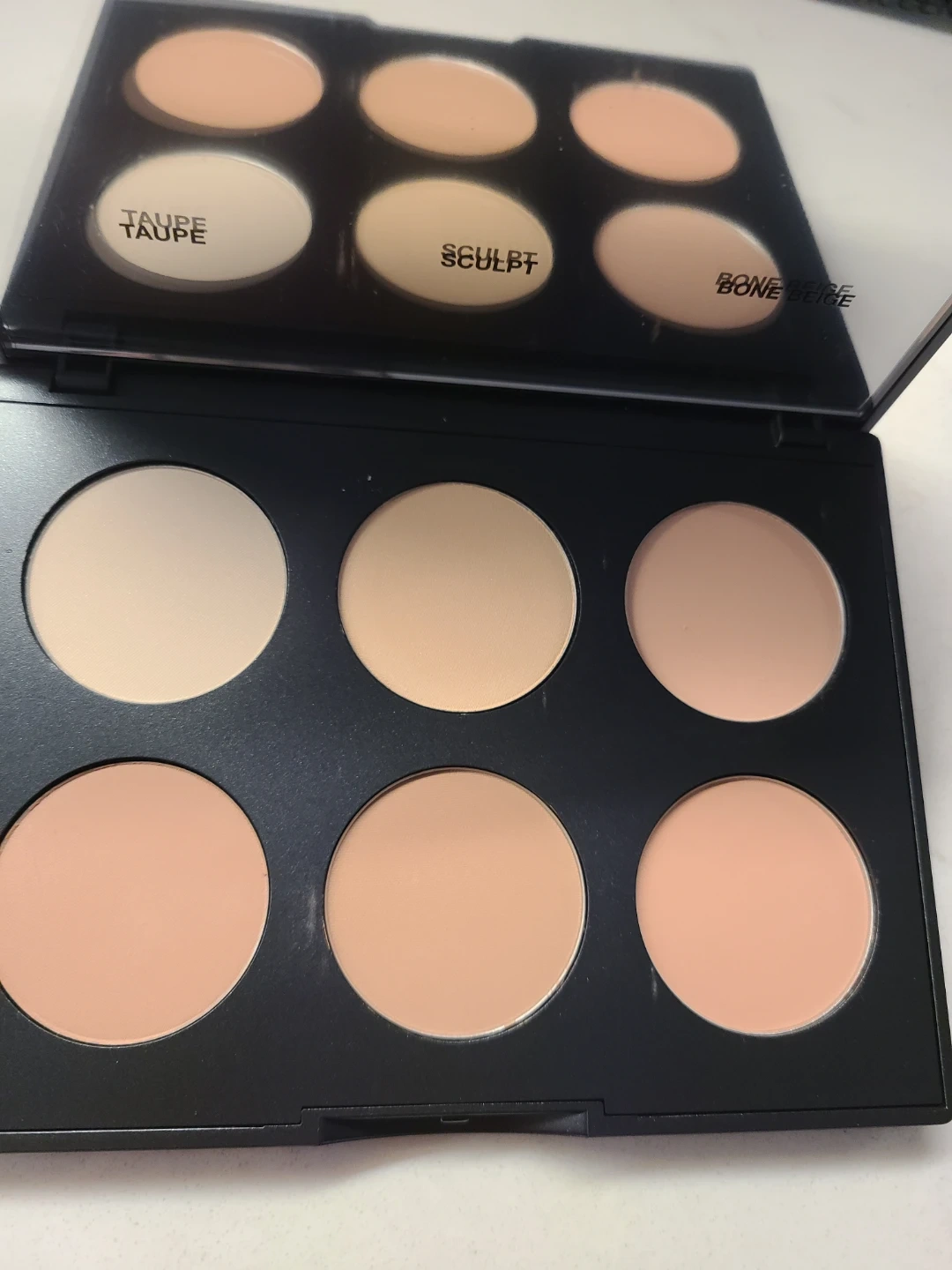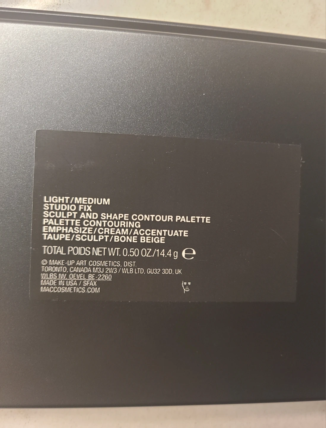 Light/Medium palette with 6 shades for contouring. Includes Emphasize, Cream, Accentuate, Taupe, Sculpt, and Bone Beige. Total net weight is 0.50 oz/14.4 g.