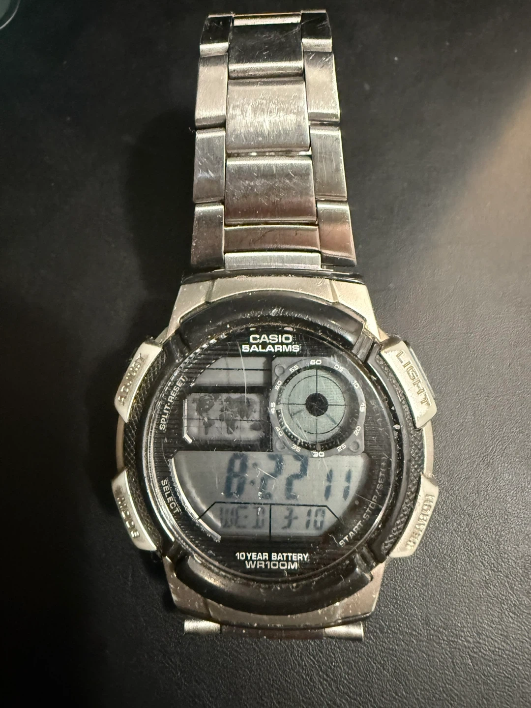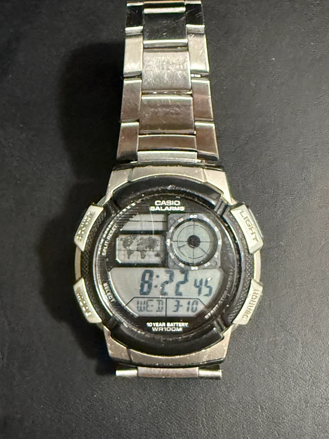 Selling a Casio Alarms WR100M watch. It has a 10 year battery and is water resistant to 100m. There are some scratches on the watch face and band, as shown in the pictures.