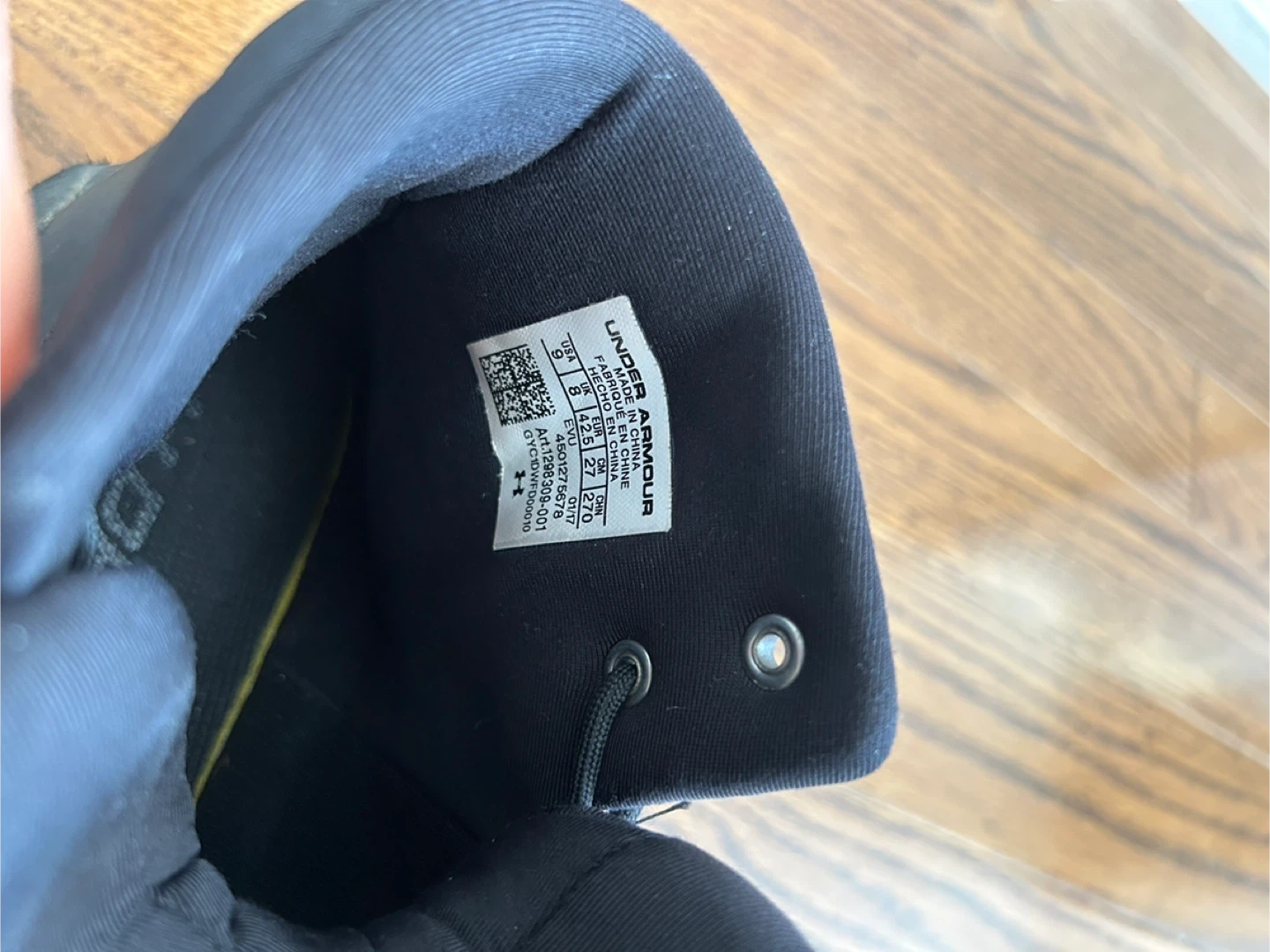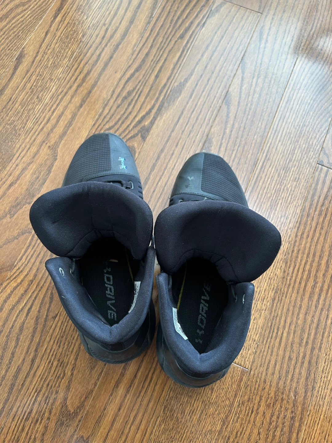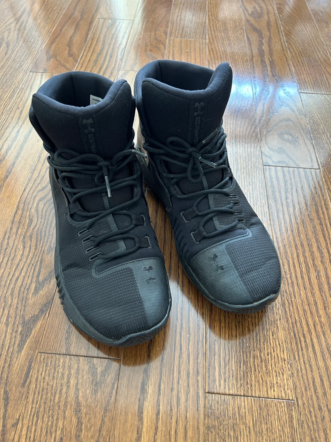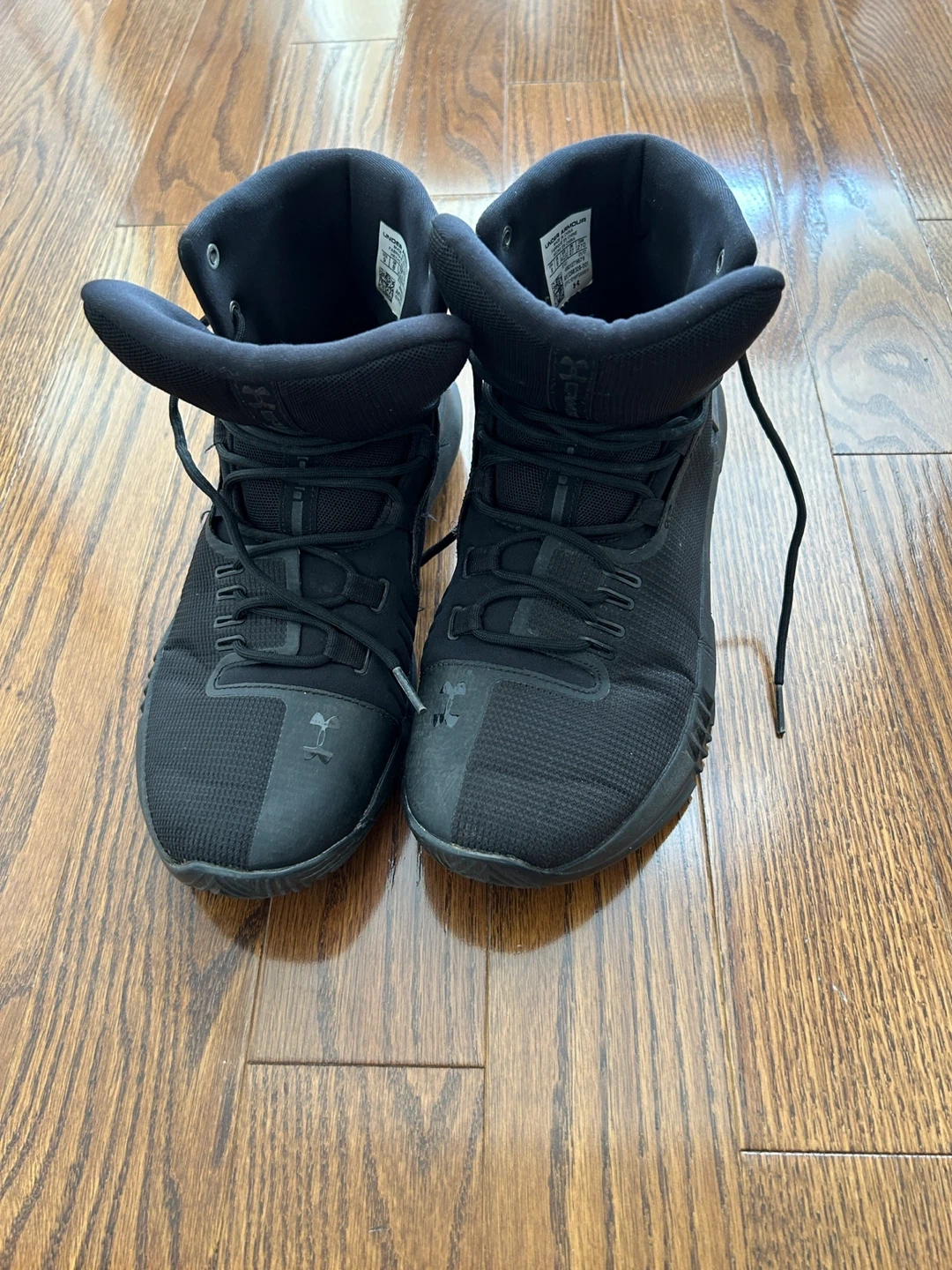 These are a pair of Under Armour black high-top basketball shoes. They are a size 9 US Men's. The shoes feature a durable rubber sole for traction. They're suitable for athletic performance or casual wear.