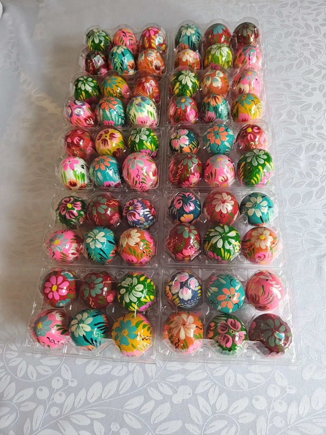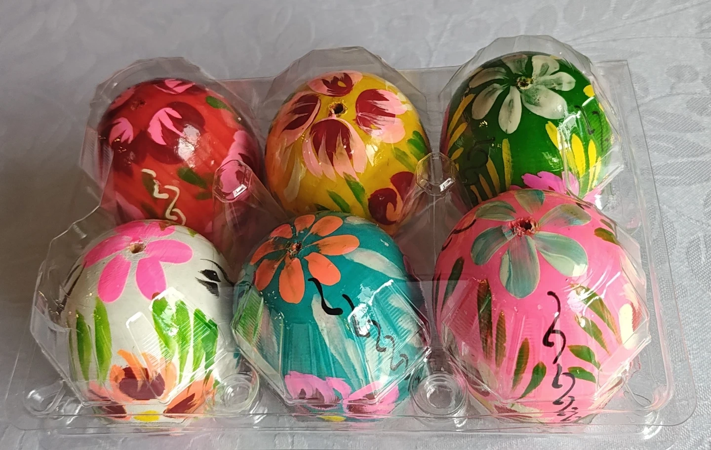 These are six beautifully hand-painted decorative Easter eggs, each with unique floral designs. They come in a clear plastic tray for display. These eggs add a festive touch to any spring or Easter decor!