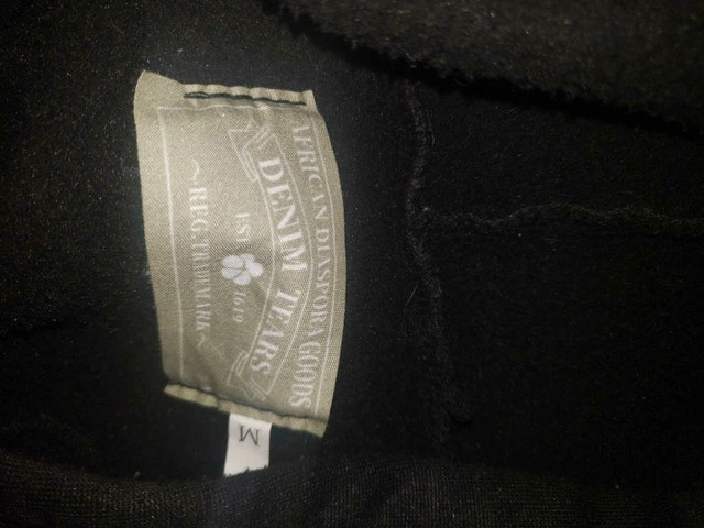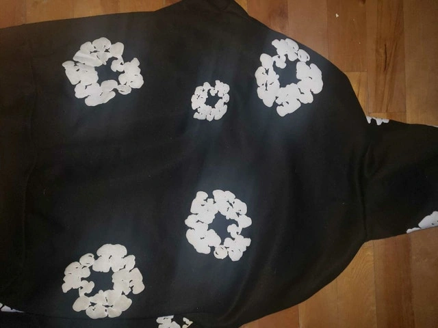 Elevate your streetwear game with this striking Denim Tears hoodie, featuring a unique floral design. The hoodie is used, but still in great condition. It's a medium size, perfect for a comfortable fit. Specifications: Brand: Denim Tears, Size: Medium, Colour: Black with white floral graphics, Material: Cotton Blend. If the ad's up, it's available!
