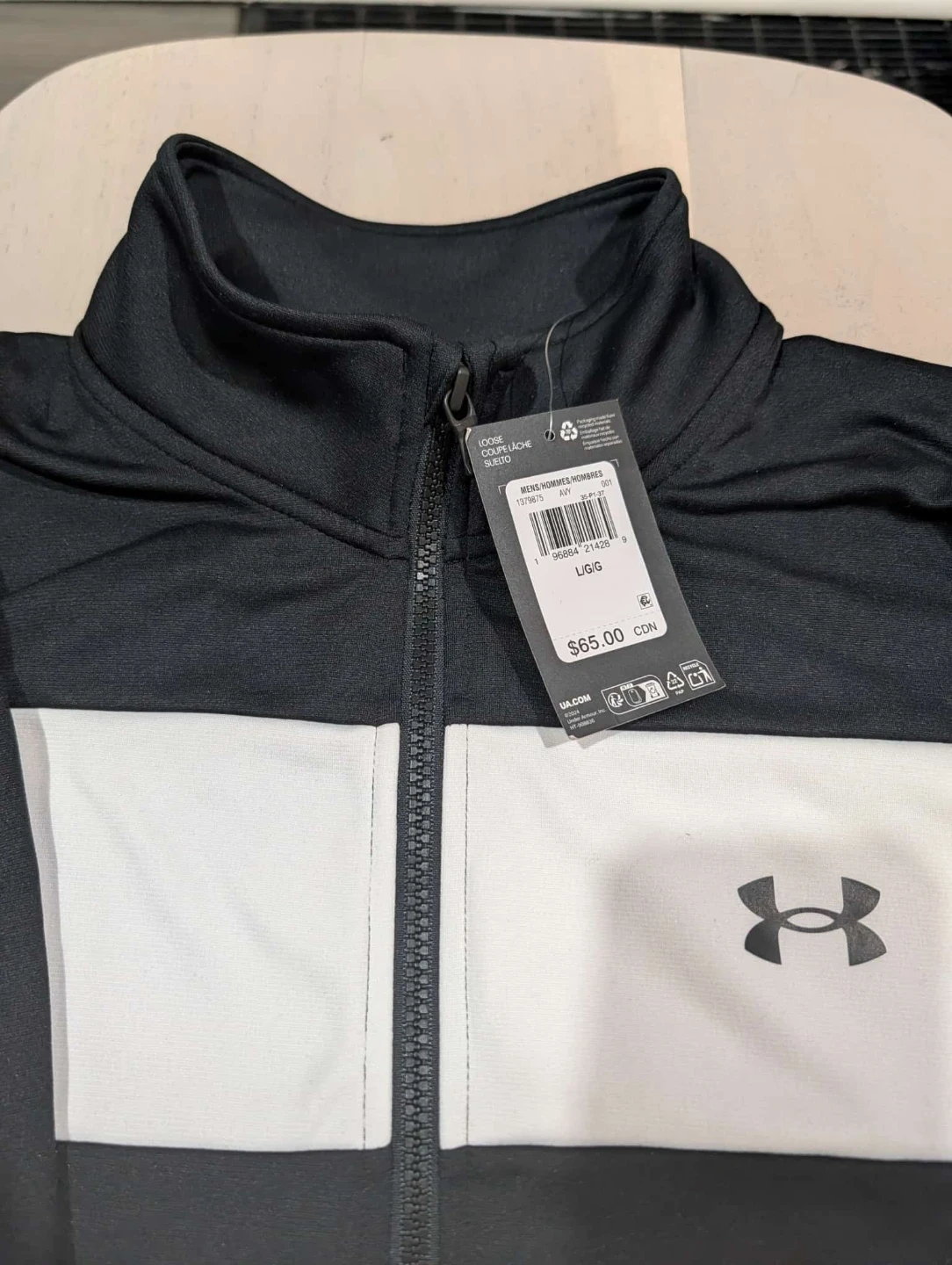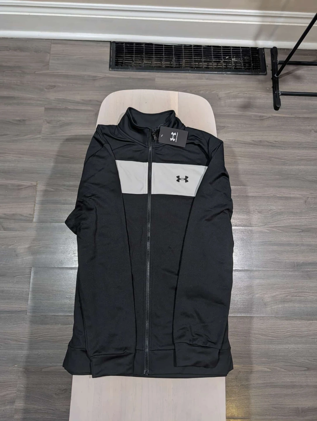 This is a men's Under Armour track jacket in black and grey. It's a size L/G. The jacket has a full zip closure and a stand-up collar.