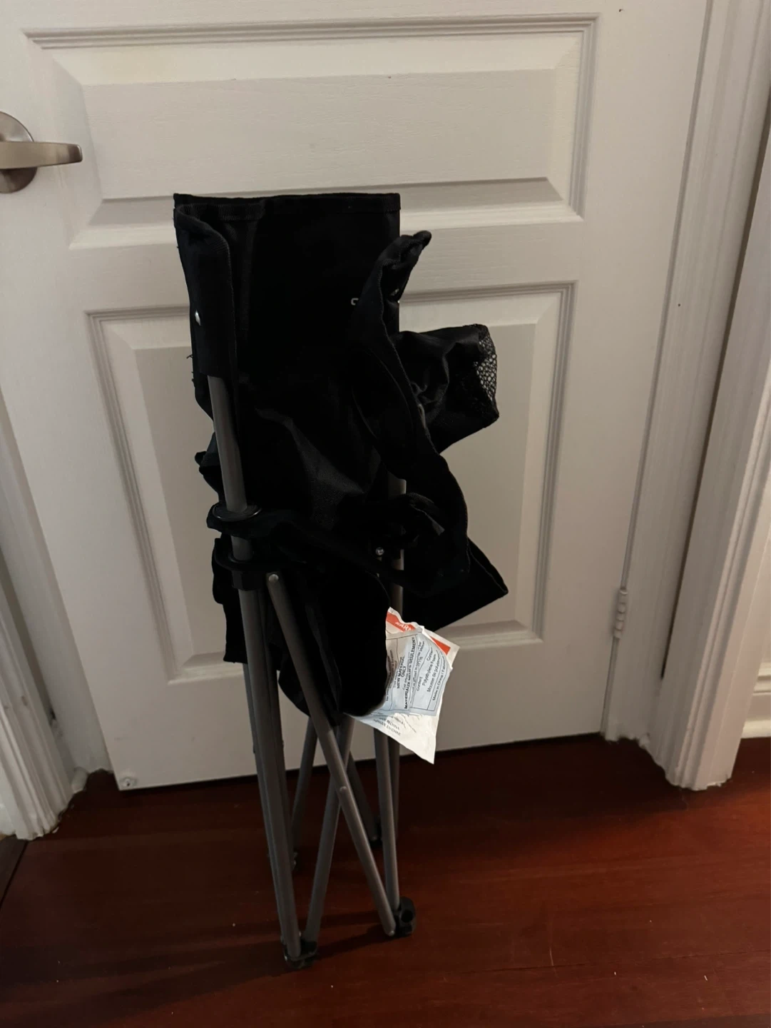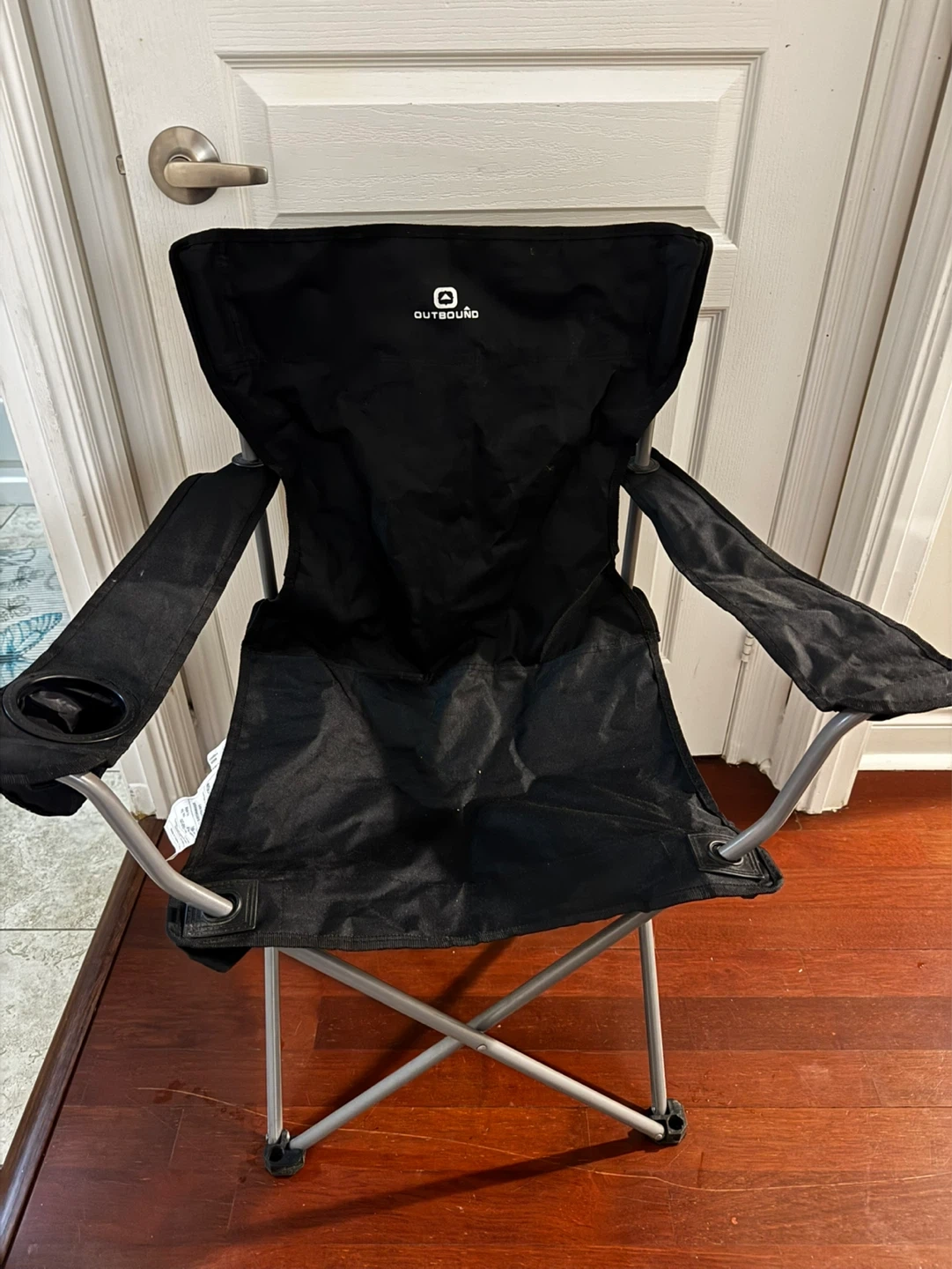 This is an OUTDOORZ folding camping chair in black. It has a built-in cup holder in the armrest for convenience. It's foldable for easy transport and storage. Great for camping trips or backyard gatherings!
