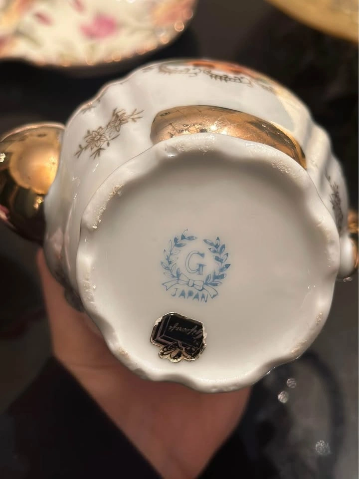 This is a vintage tea set made in Japan. The set includes a teapot, creamer, sugar bowl, and four teacups with saucers. The pieces feature a delicate floral and romantic scene design, depicting a scene of a courting couple in Victorian attire, with gold trim accents. It is made of porcelain.