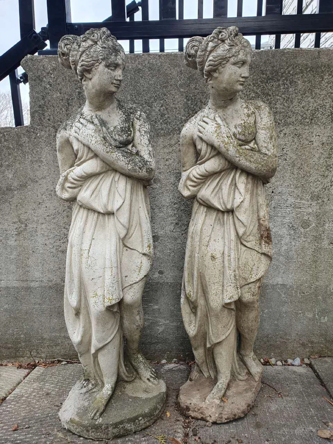 These are two charming vintage garden statues depicting women in draped classical attire. They're made of concrete and show some weathering, adding to their character. These statues would be a lovely addition to any garden or outdoor space. $150 for both of them.