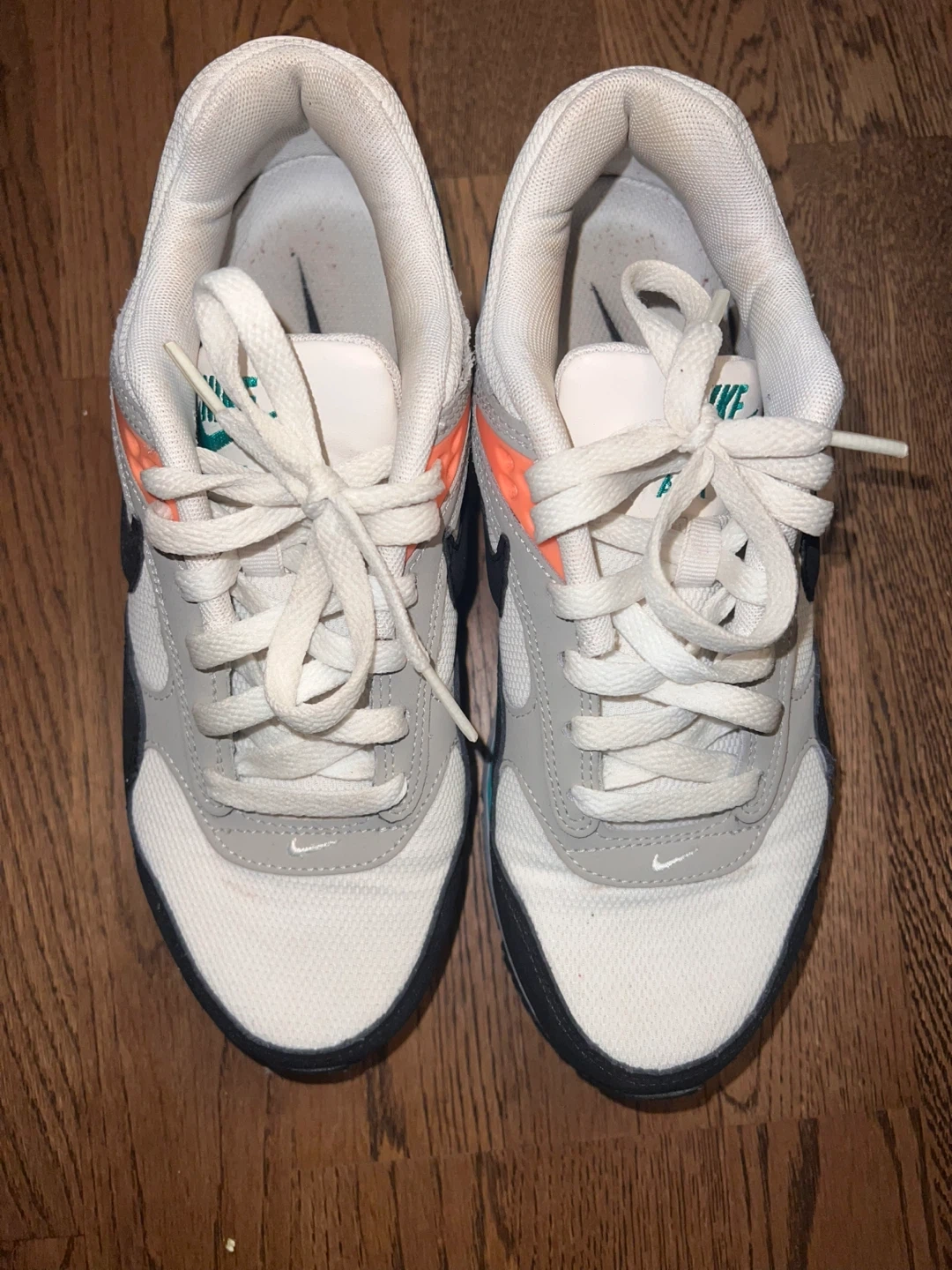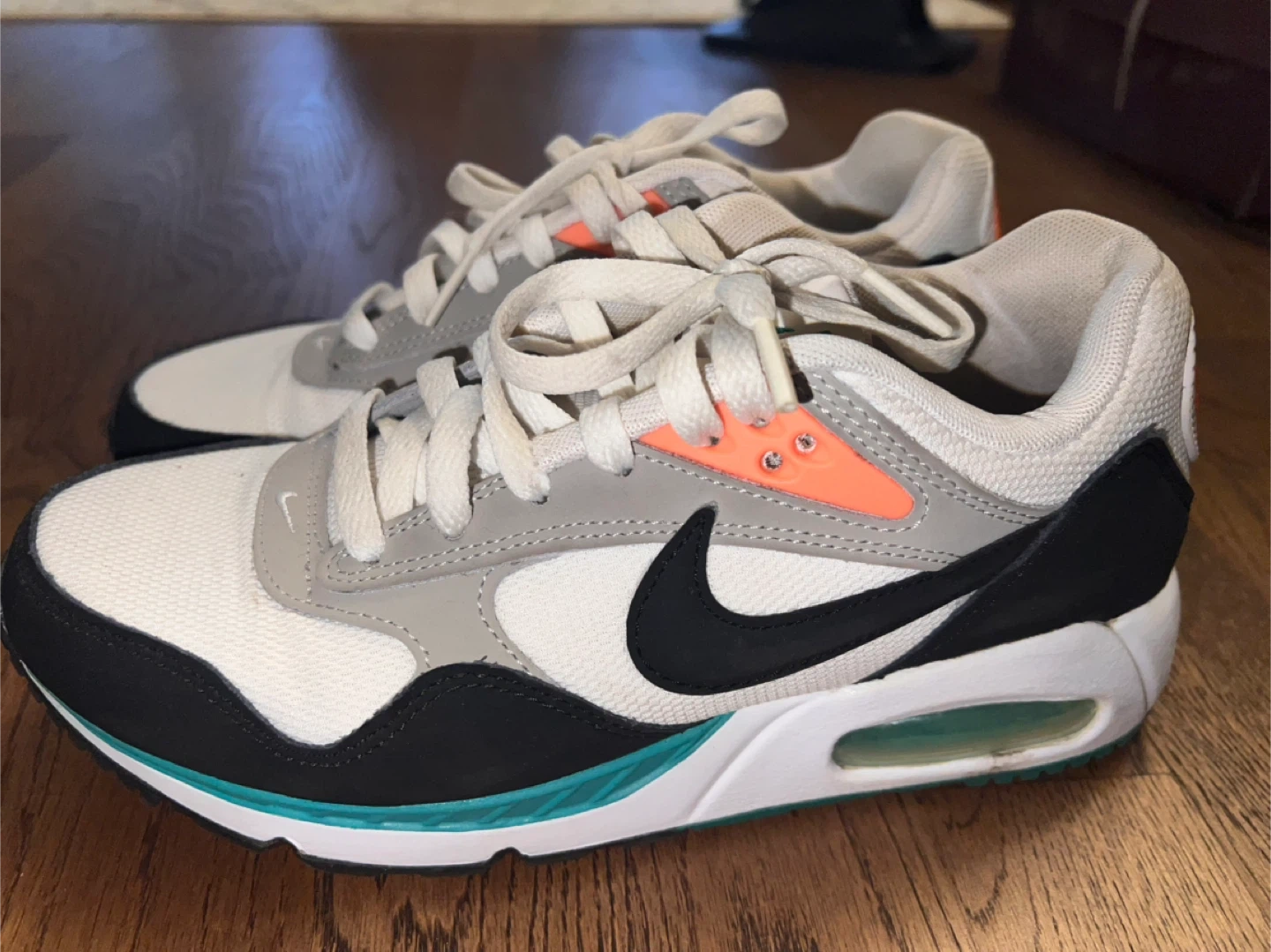 Women's Nike Air Max Correlate sneakers in white, black, and coral. Features a comfortable air sole unit. These shoes are great for everyday wear or light athletic activities.