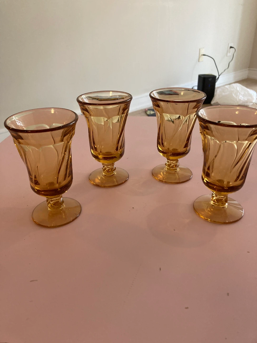 This is a set of four amber-coloured glass goblets. They're made of clear glass with a swirling pattern. These goblets are perfect for serving drinks at special occasions.