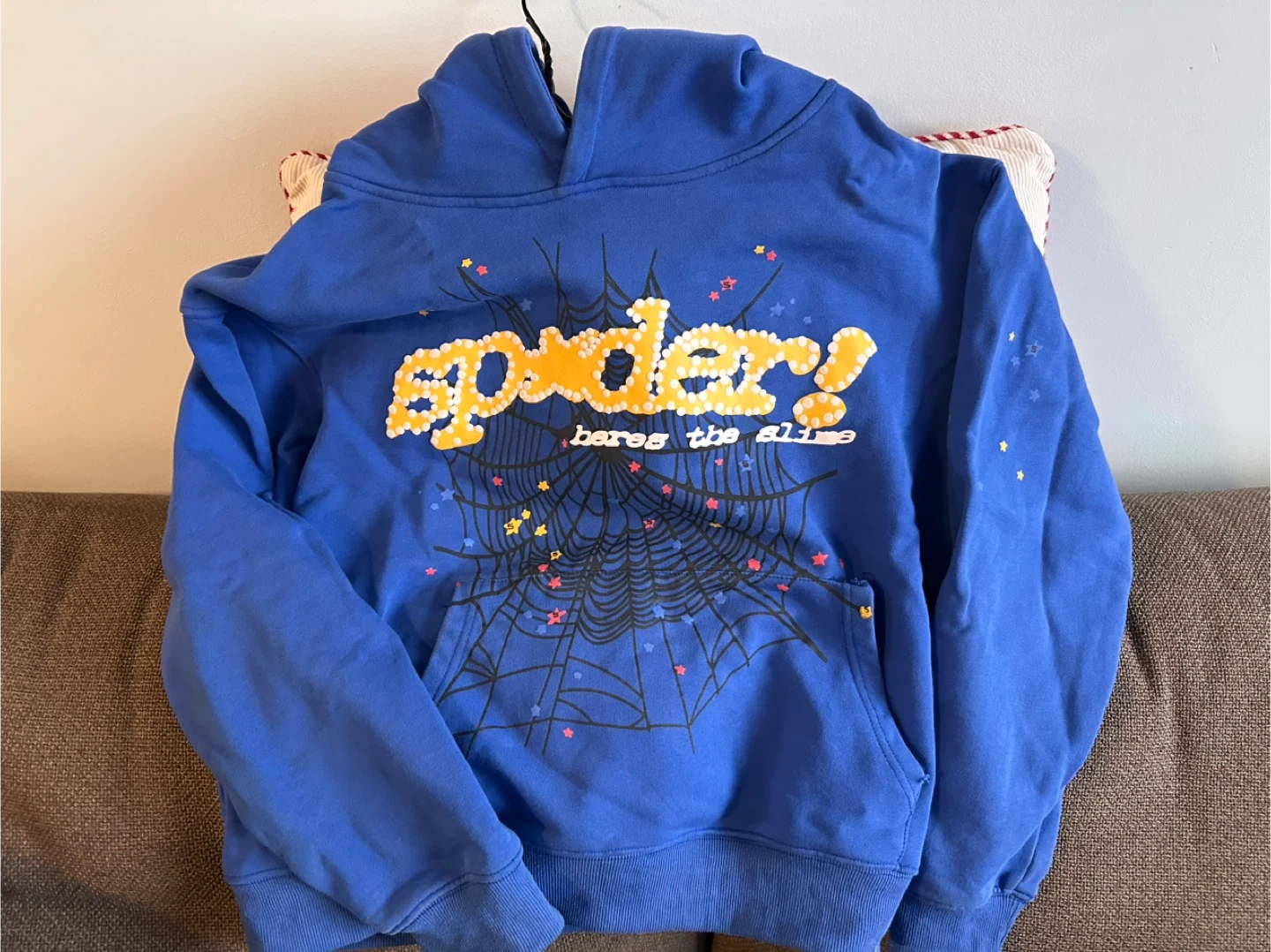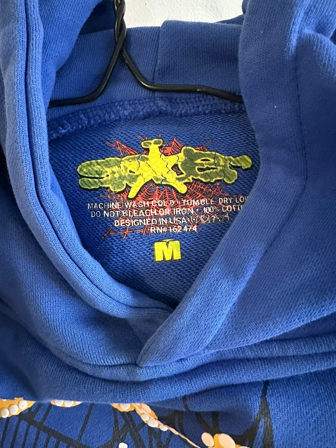 This is a blue SPIDER hoodie with a "Heres the Slime" graphic. It's made of 100% cotton. Machine wash cold, tumble dry low. Designed in USA.