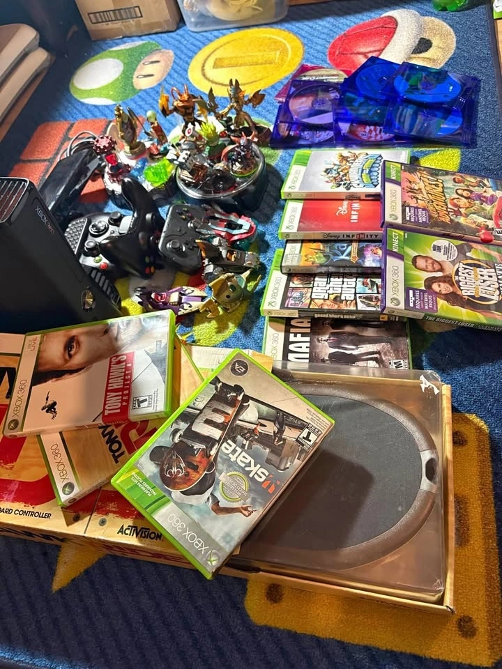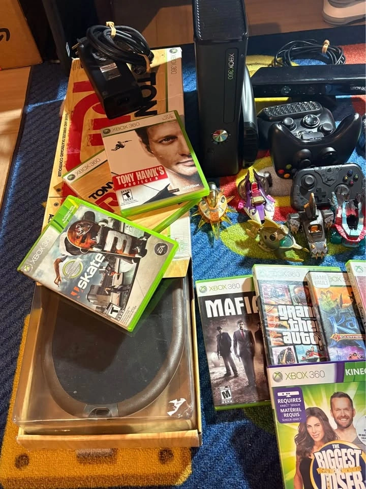 Includes Xbox 360 console with 2 controllers, Kinect sensor, Skylanders portal with figures, Tony Hawk skateboard and games, and power supply. Make an offer!