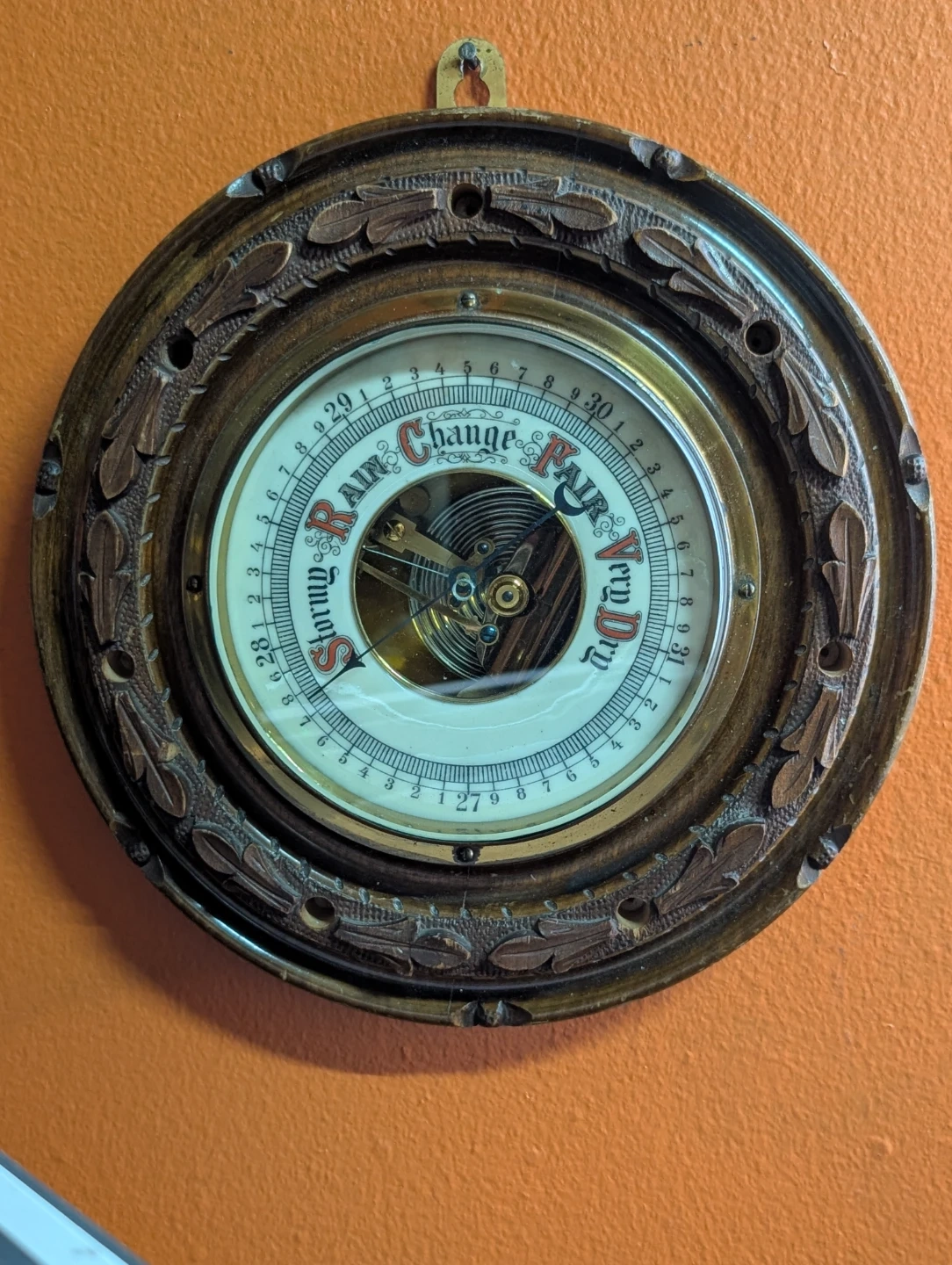 Selling a vintage weather barometer with a beautifully carved wooden frame. The dial indicates "Stormy, Rain, Change, Fair, Very Dry" with numerical values. A unique piece for any home!
