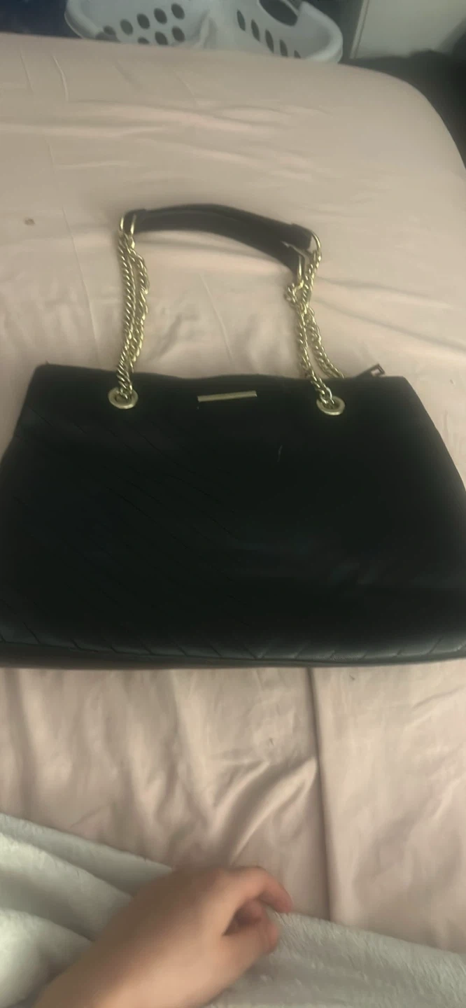 Stylish black quilted shoulder bag with a gold-tone chain strap. It's made from a faux leather material and features a chevron pattern. It has a zippered closure.