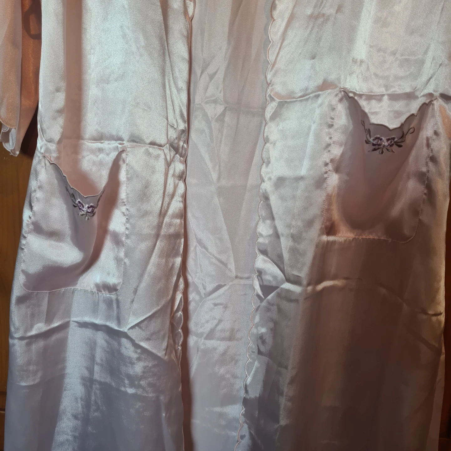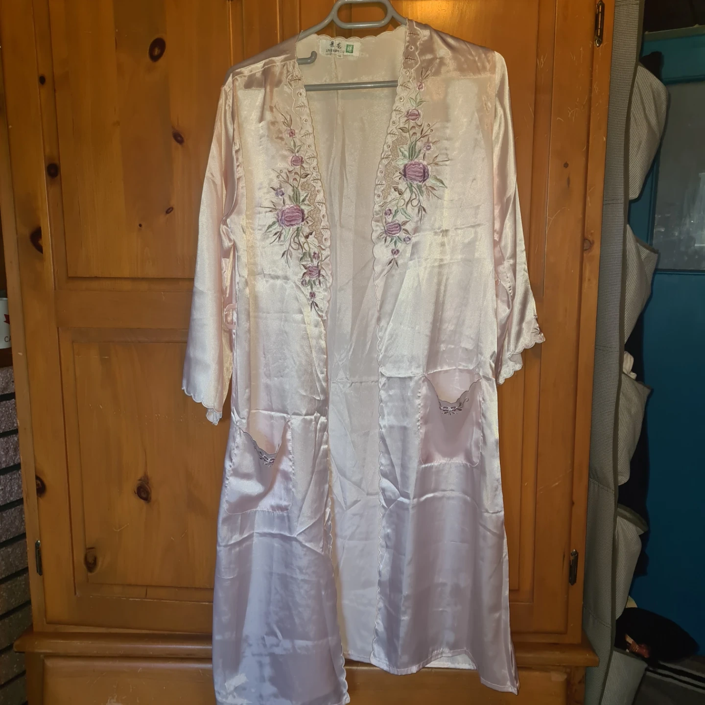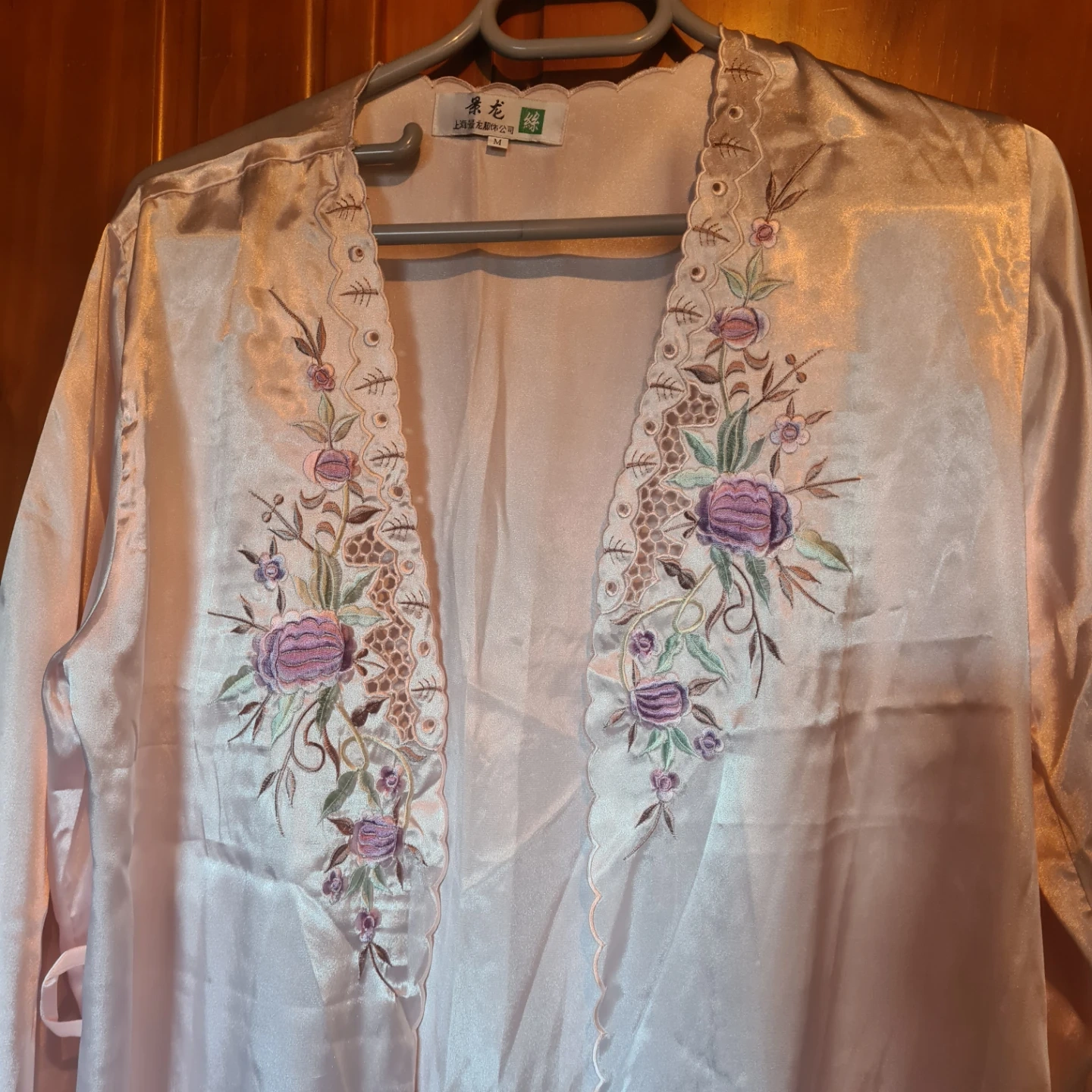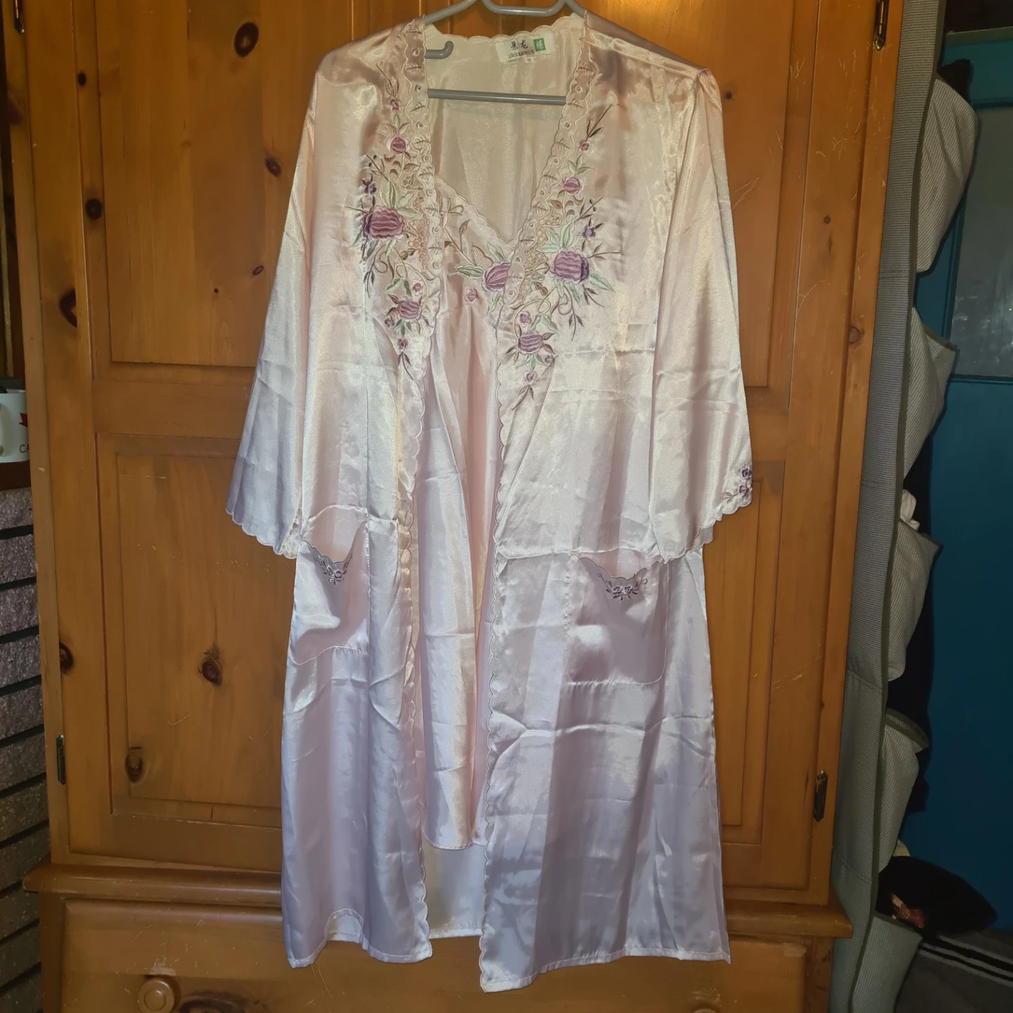 This is a two-piece satin-like sleepwear set featuring a camisole and a matching robe. It's adorned with delicate floral embroidery on the neckline of the camisole and the lapels of the robe. The fabric has a lovely sheen and is lightweight. The robe includes pockets. A ruban belt is included.