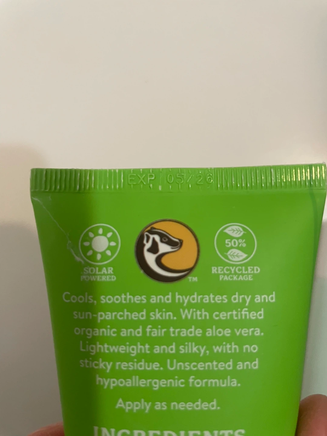 - Badger Aloe Vera After Sun Gel (118ml/4 fl oz). Expiry Date: 2026 May 28. Used 1-2 times.