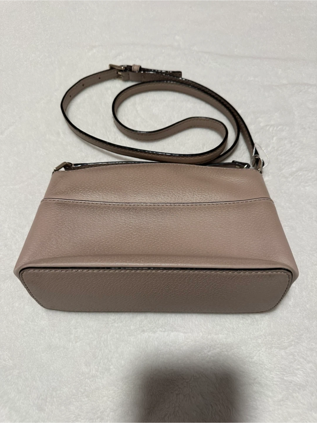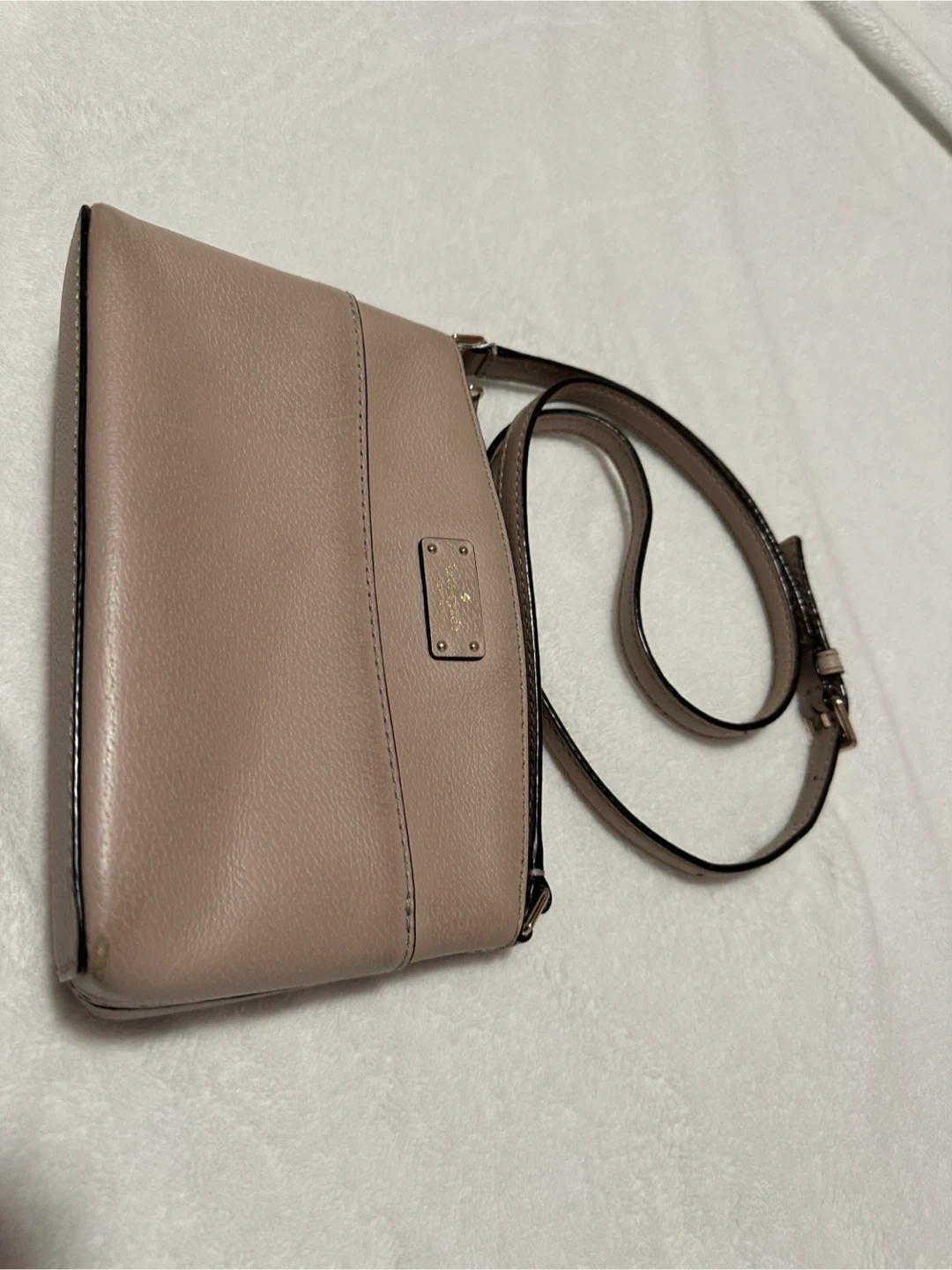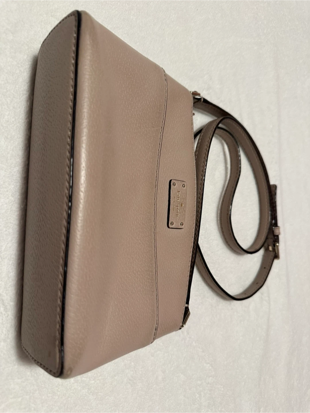 A classic Kate Spade crossbody bag in a lovely nude. It's made from genuine leather and features a secure zip closure. The interior is lined with branded fabric and has a small patch pocket. This bag's simple design makes it a versatile accessory for everyday use!