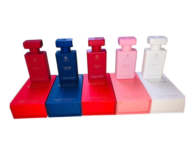 Set of five Oakcha perfumes in their original boxes.