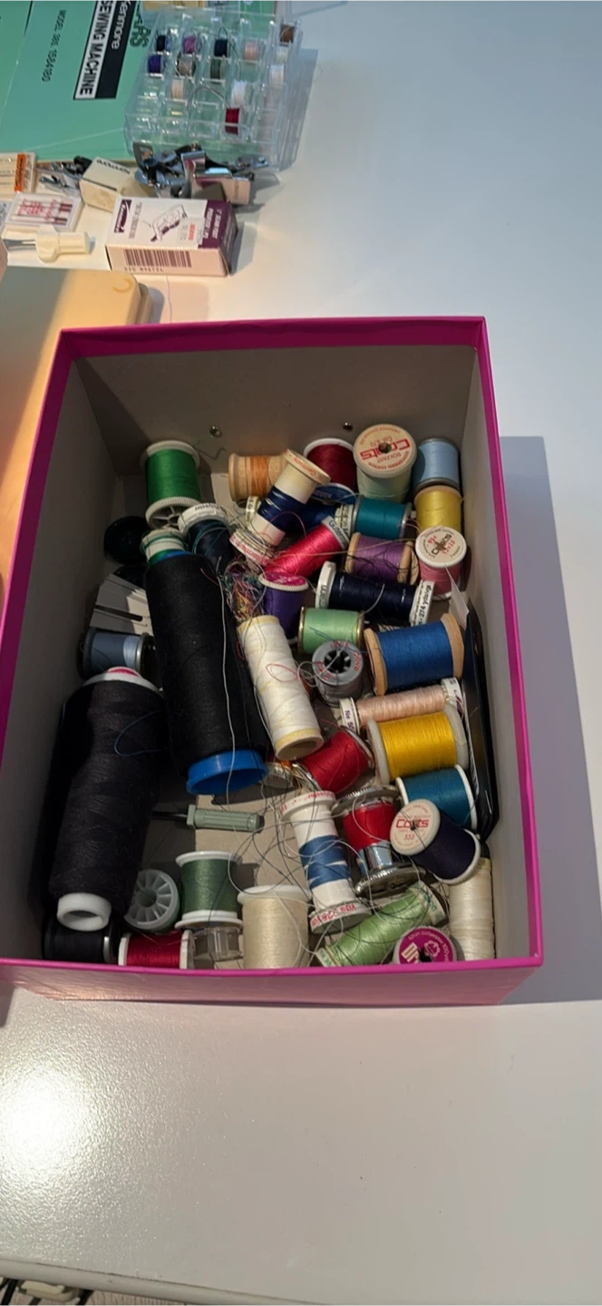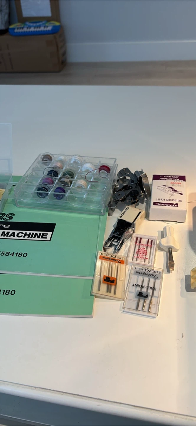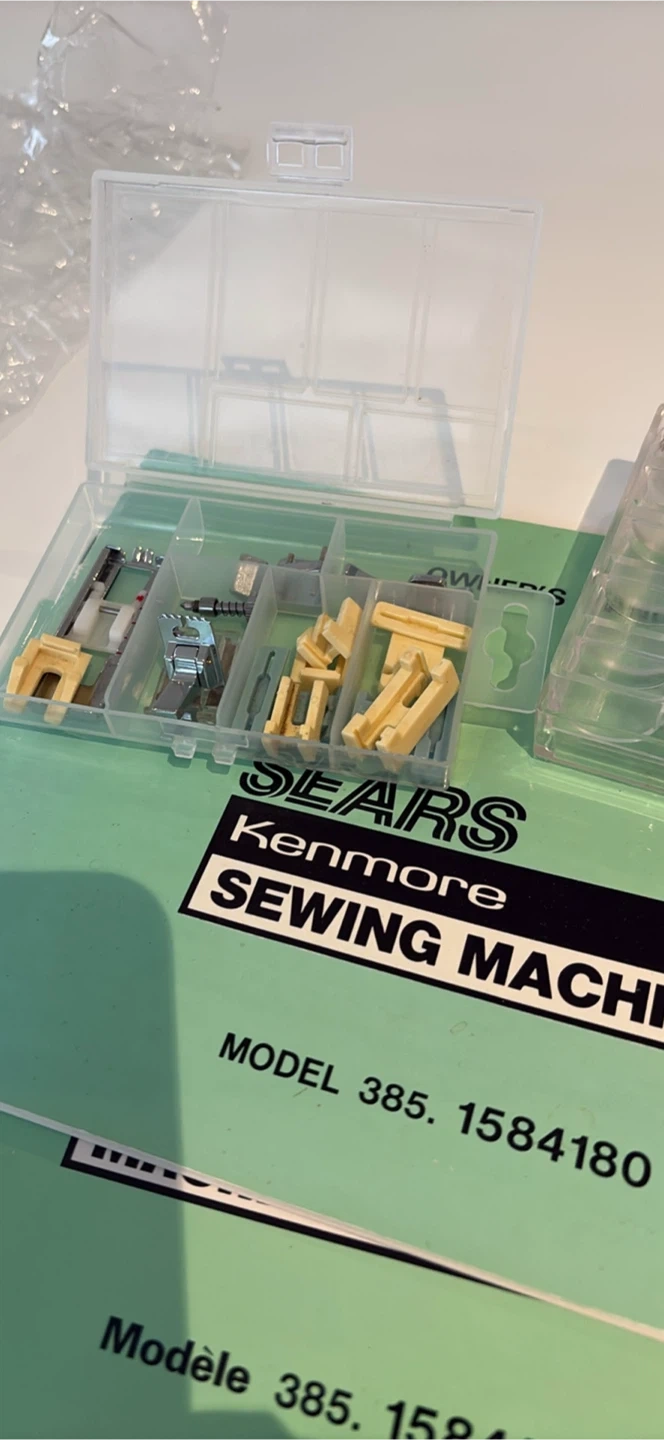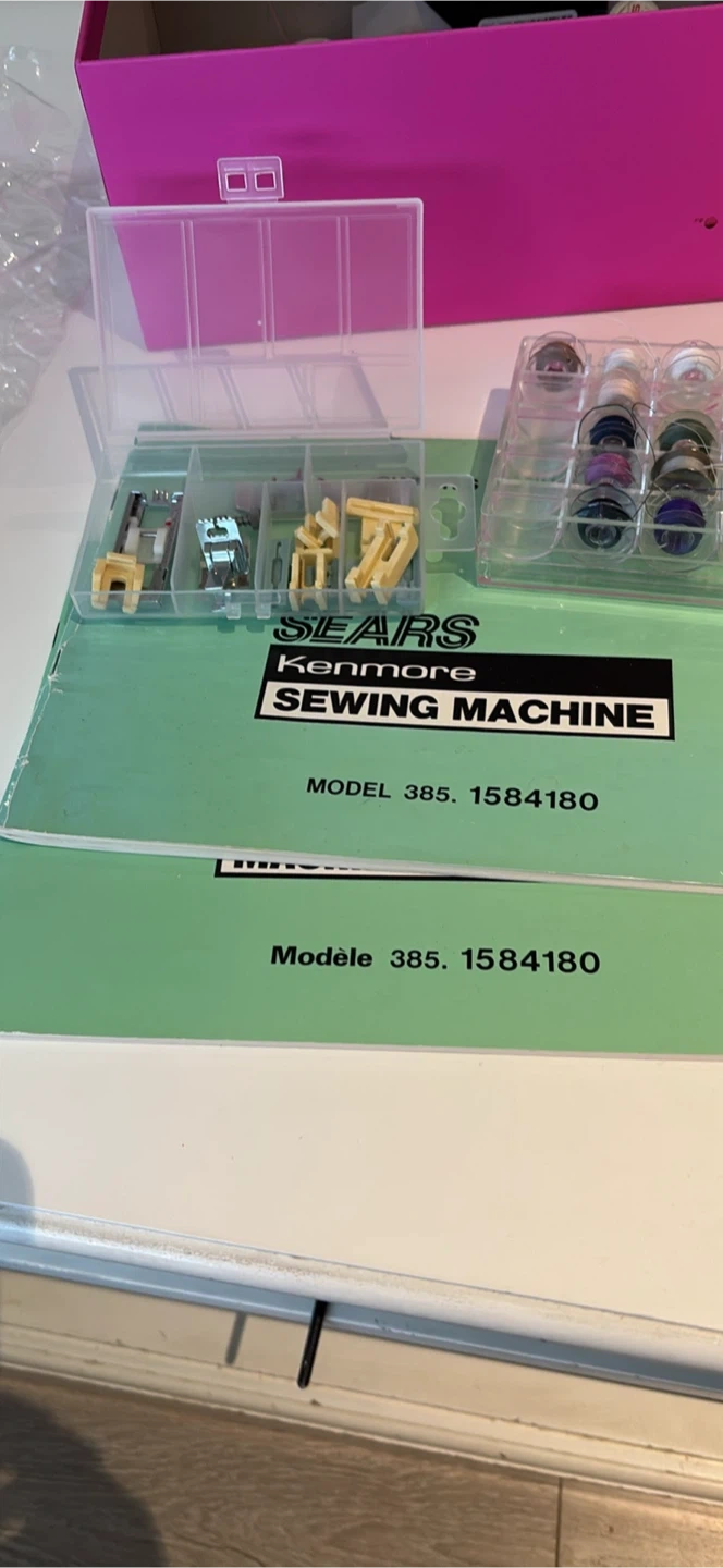 This Kenmore sewing machine comes with a variety of sewing feet, needles, and thread spools in a storage case. It's a Kenmore model 385.1584180. This machine is ready for your next sewing project!