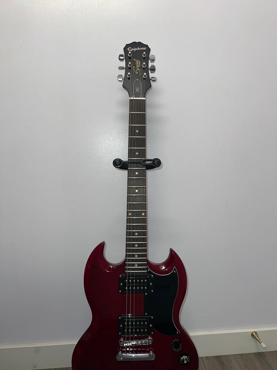 Epiphone Special SG electric guitar in cherry red. Features dual humbucker pickups and a toggle switch. Made in Indonesia. This guitar is great for learning or playing rock music!