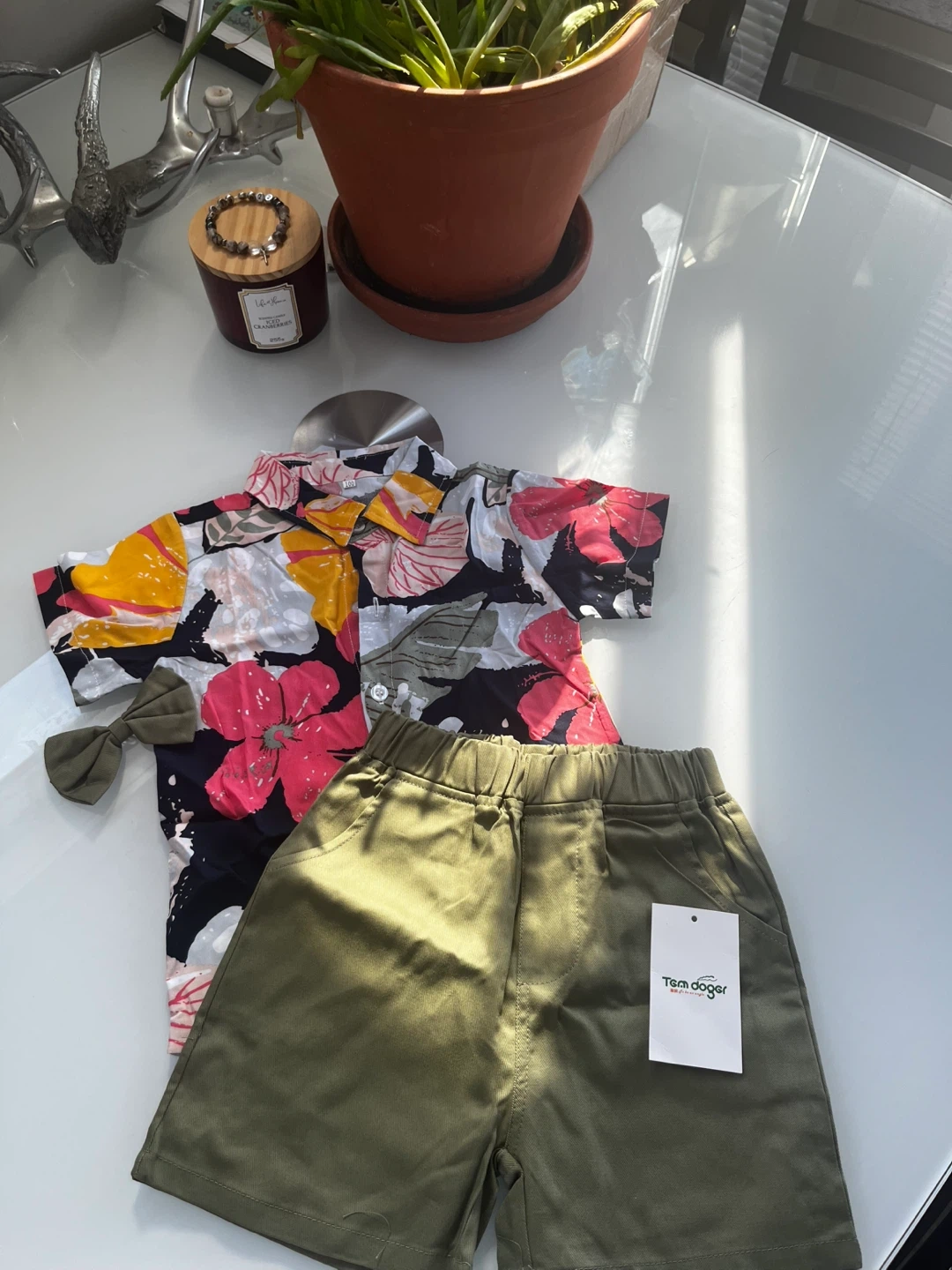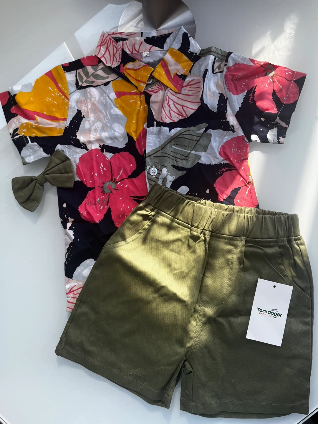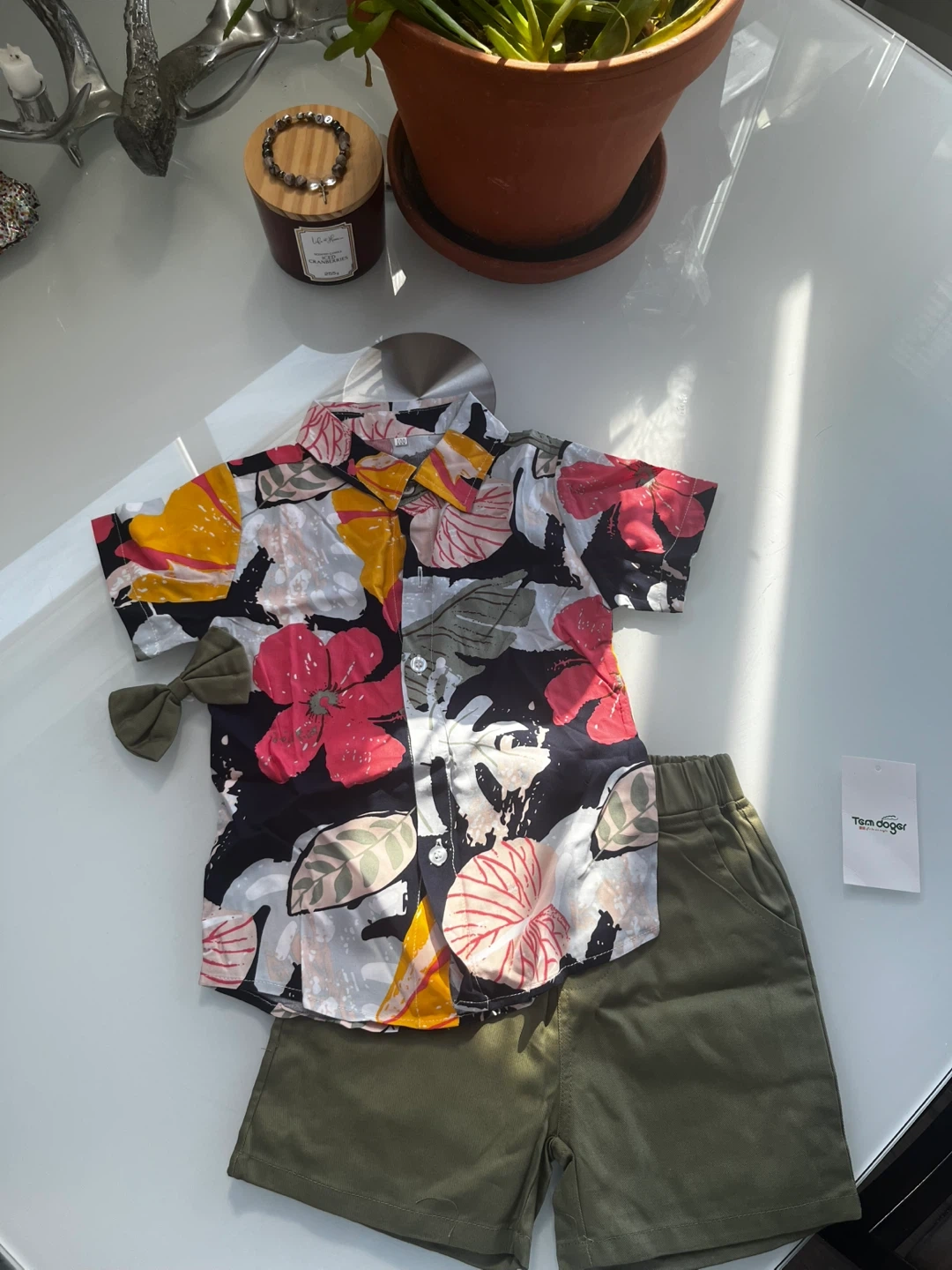 This adorable set includes a short-sleeve button-up shirt with a colourful floral print and matching olive green shorts. It also comes with a coordinating bowtie.