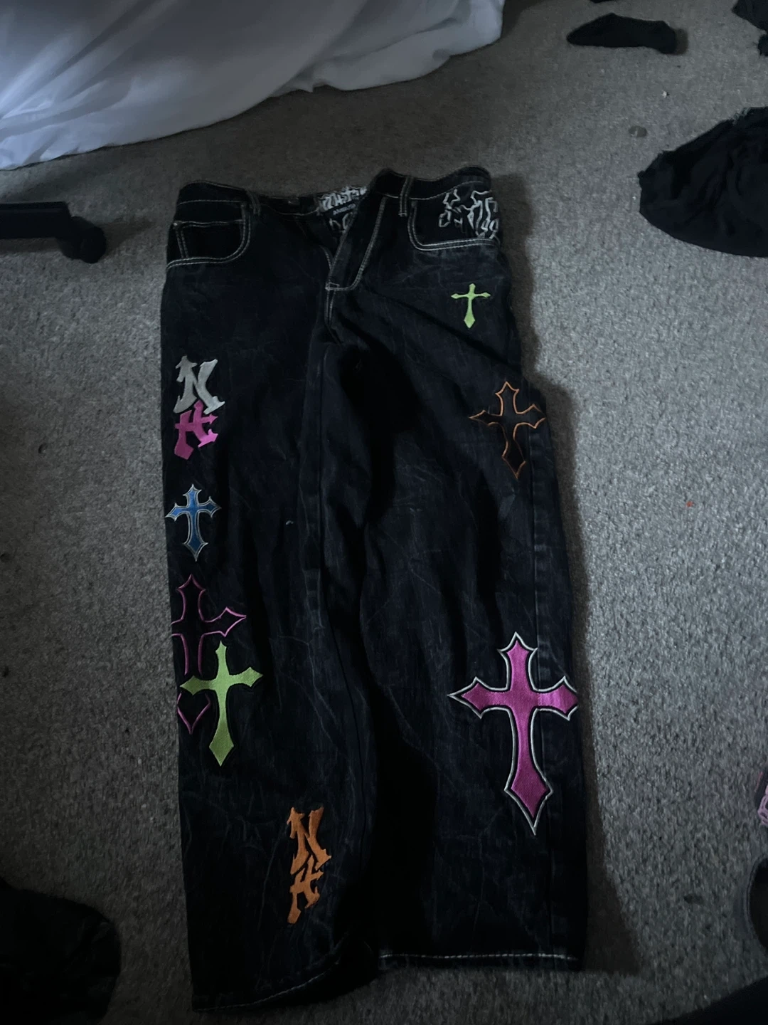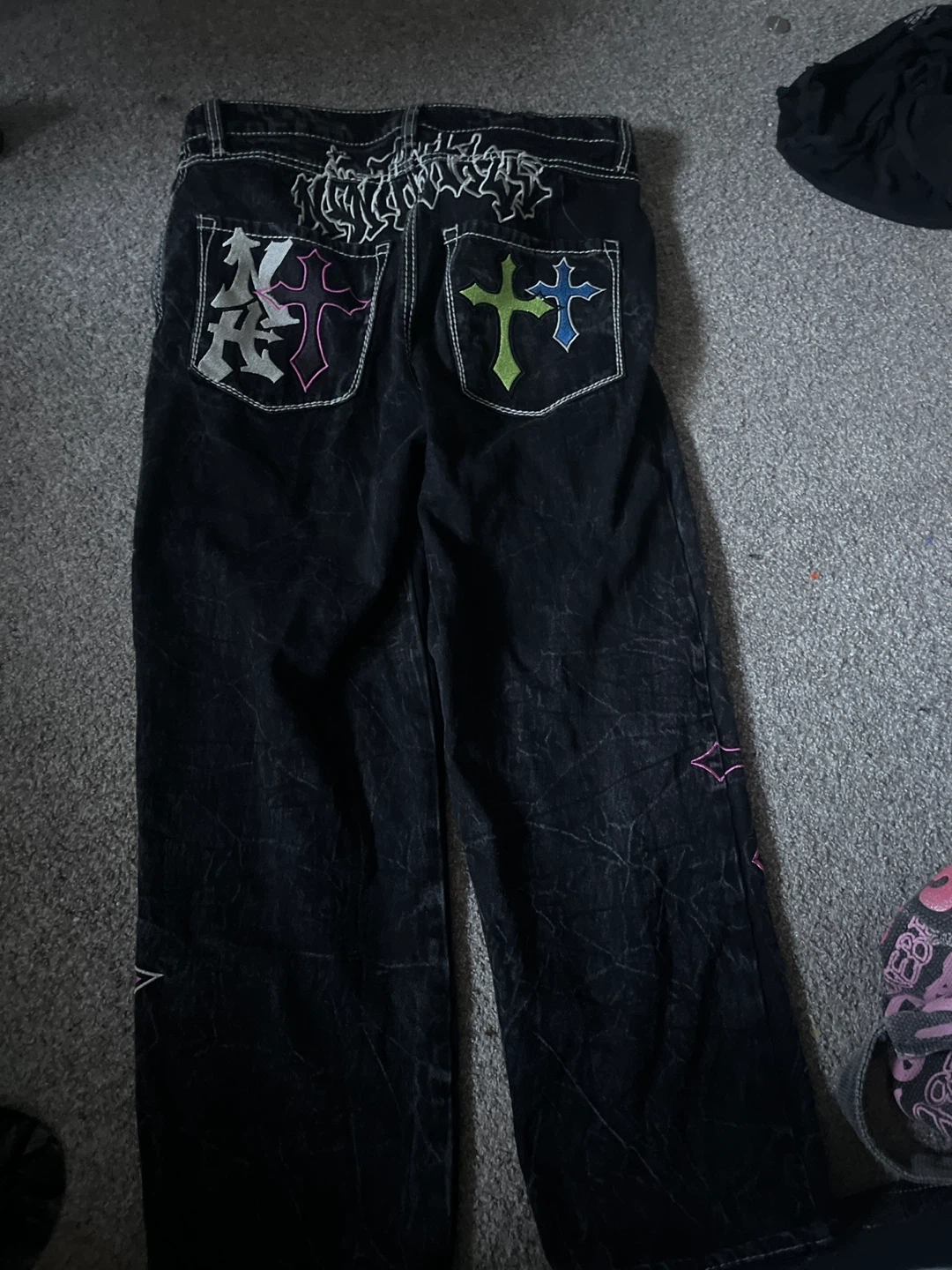 These black denim jeans feature colourful embroidered crosses on the front and back pockets. They're made of durable denim with white contrast stitching. These pants are a statement piece for anyone looking to add some unique flair to their wardrobe!