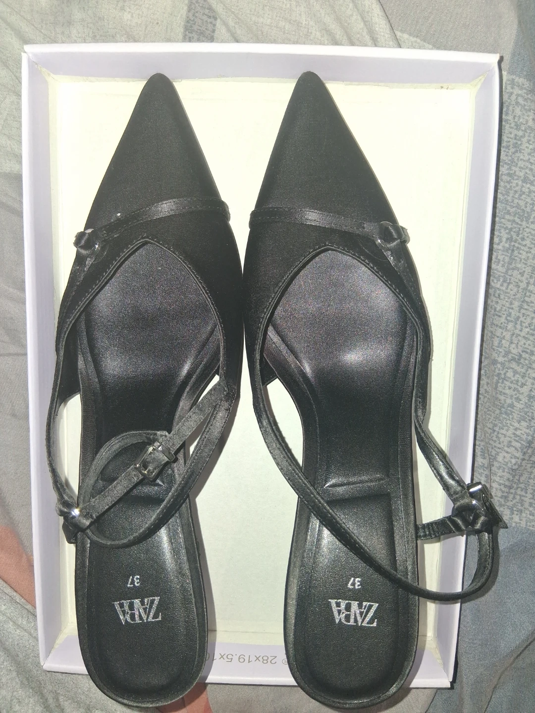 These are black slingback heels from Zara. They feature a pointed toe and adjustable ankle straps with buckle closures. The material appears to be satin.