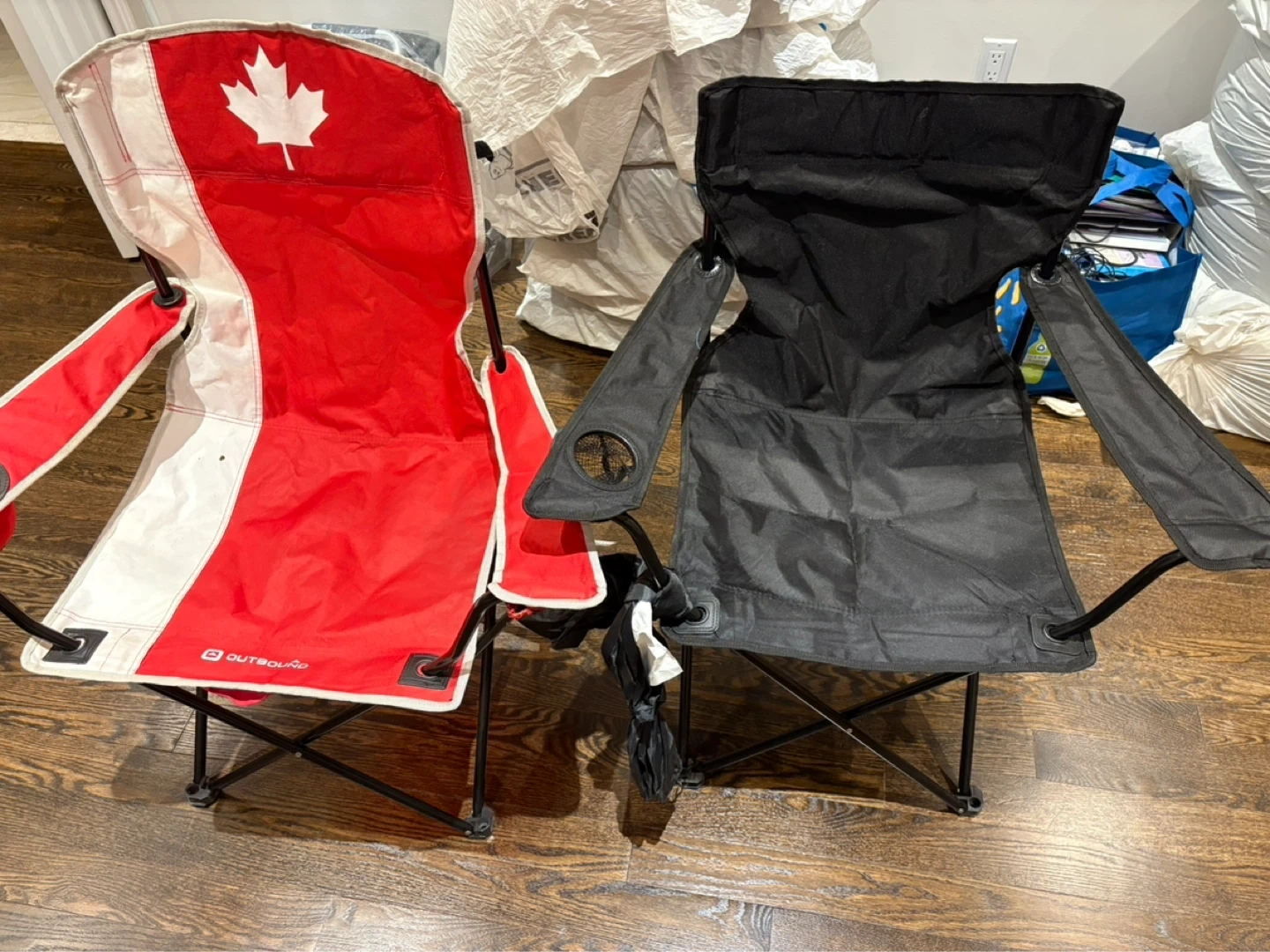Two folding camping chairs, one with a Canadian flag design and the other black. Both have cup holders built into the arms. Great for backyard BBQs or camping trips!